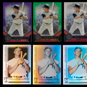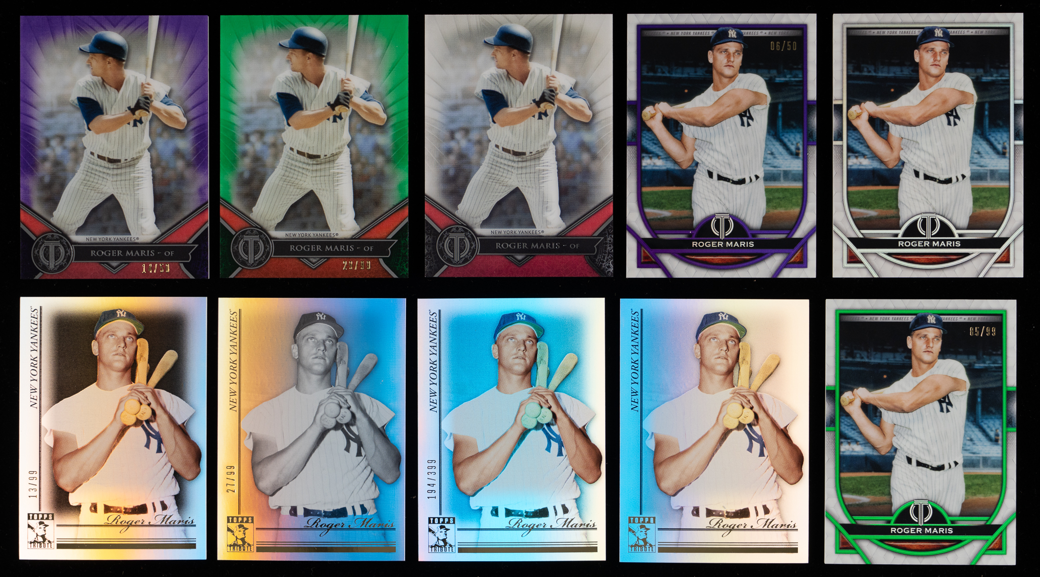 Comprehensive trio of 2010-2021 Topps Tribute Roger Maris rainbow parallel sets. The following modern inserts of the New York Yankees bomber are present: 2010 Topps Tribute #23 Rainbow: (6/6 cards) with #1/1 red, #/50 gold, #/99 black, #/99 black & white, #/399 blue, base; 2017 Topps Tribute #9 Rainbow: (5/5 cards) with #1/1 black, #/10 red, #/50 purple, #/99 green, base; 2021 Topps Tribute #83 Maris Rainbow: (cards) with #1/1 black, #/10 red, #/50 purple, #/99 green and base.