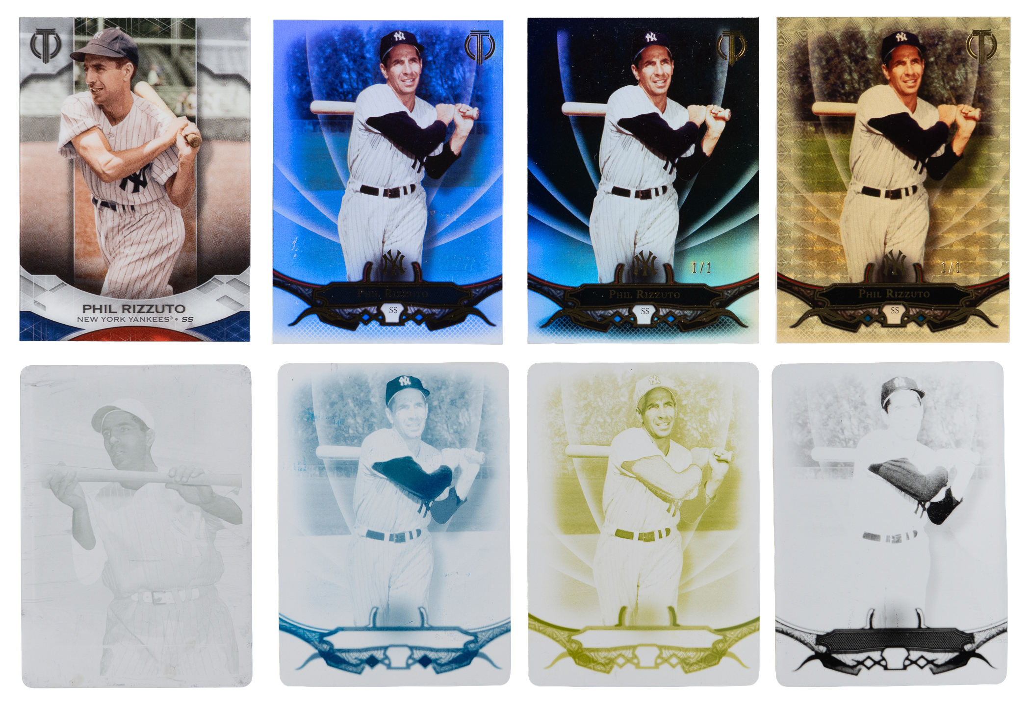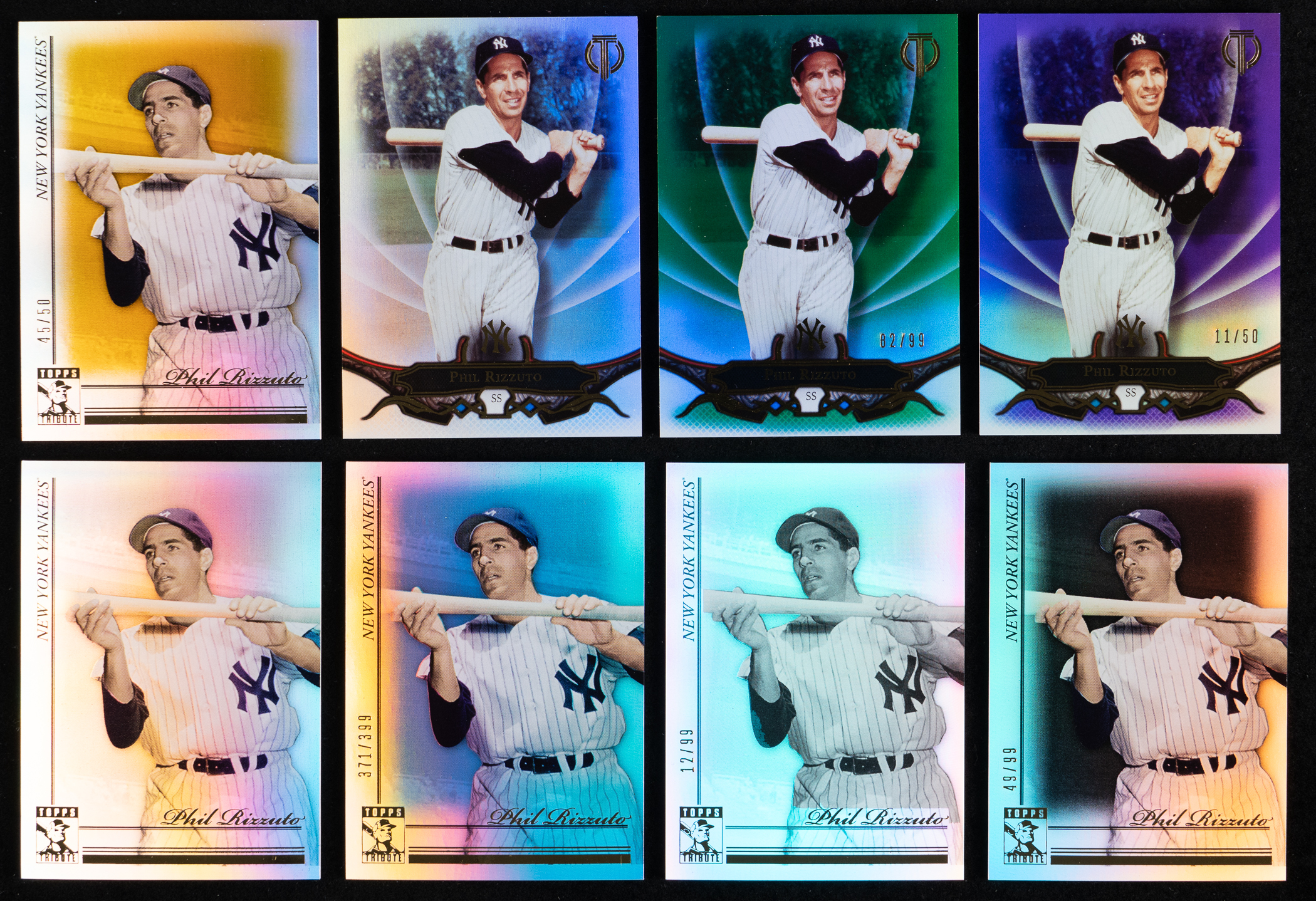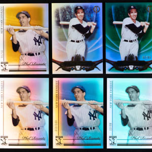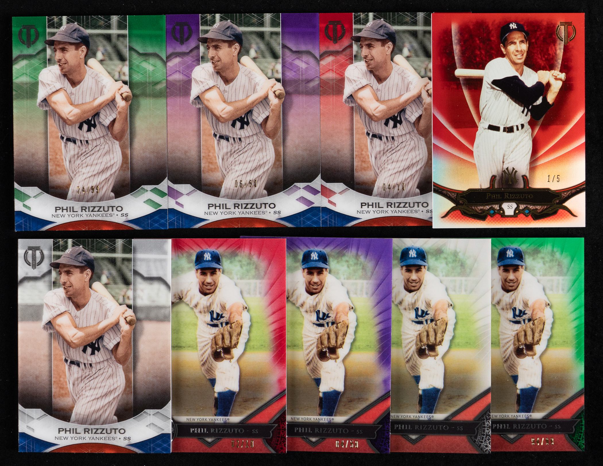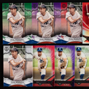 Superfractor! "Scoot" your bidding plan toward the offered 2010-2019 Topps Tribute Phil Rizzuto complete/near rainbow collection of (25) different parallels featuring multiple complete/near rainbow sets. The following modern inserts of the New York Yankees Hall of Fame shortprint are present: 2010 Topps Tribute #32 Rainbow near: (6 cards) with #1/1 yellow printing plate, #/50 gold, #/99 black, #/99 black & white, #/399 blue, base; 2016 Topps Tribute #45 Rainbow set: (10 cards) with #1/1 black printing plate, #1/1 cyan printing plate, #1/1 yellow printing plate, #1/1 Vault, #1/1 superfractor, #1/1 black, #/5 red, #/50 purple, #/99 green, base; 2017 Topps Tribute #73 Rainbow near: (4 cards) with #/10 red, #/50 purple, #/99 green, base; 2019 Topps Tribute #14 Rainbow near: (5 cards) with #1/1 Vault, #/10 red, #/50 purple, #/99 green and base.