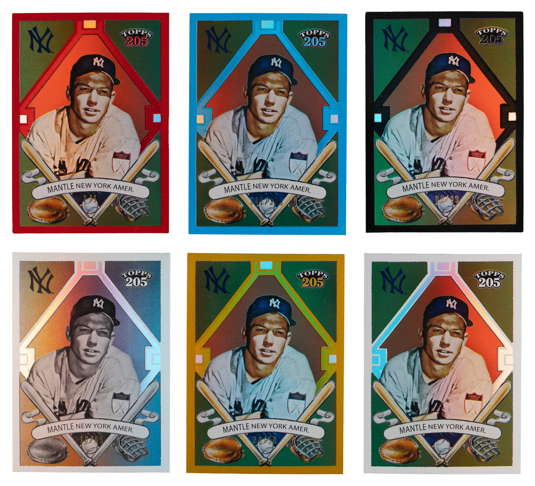 The offered 2010 Topps Tribute #82 Mickey Mantle rainbow set of six different parallels is fashioned after the 1911 T205 Gold Borders designation. The following high-end modern inserts of the New York Yankees Hall of Fame icon are present: #1/1 red, #/50 gold, #/99 black, #/99 black & white, #/399 blue and base.