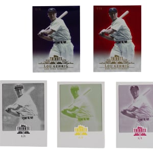 Dynamic 2013 Topps Tribute #88 Lou Gehrig rainbow set of (10) different parallels featuring a round tripper of #1/1 inserts! The following modern inserts of the Murderers' Row basher are included: #1/1 black printing plate, #1/1 magenta printing plate, #1/1 yellow printing plate, #1/1 purple, #/5 red, #/25 gold, #/50 orange, #/75 green, #/99 blue and base.