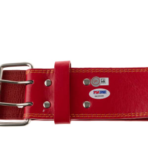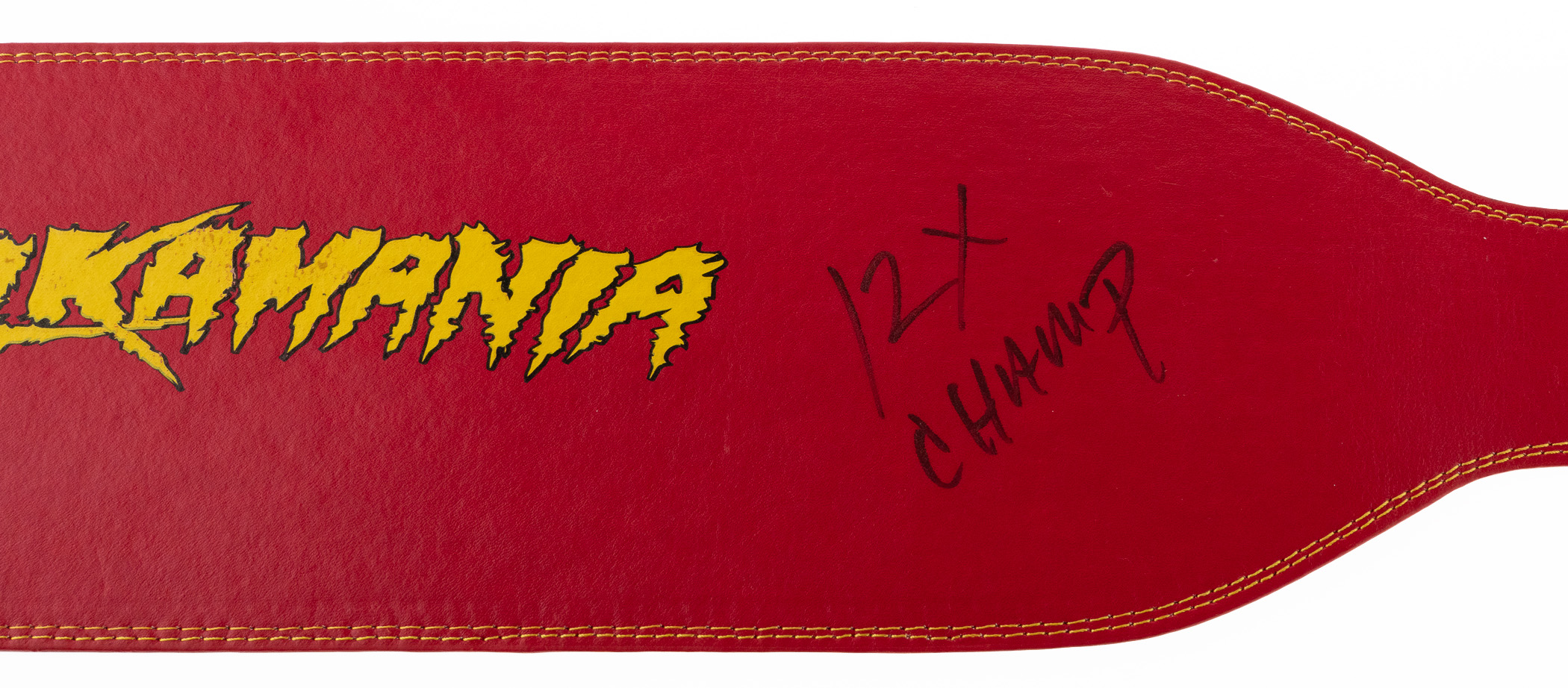 Hulkamaniacs will love this signed and inscribed weight belt which was signed in the presence of a PSA/DNA representative and comes with their COA and hologram sticker. There is also a hologram/sticker from SM.com. The Hulkster has signed “Hulk Hogan - 12X Champ” (“8-9”).