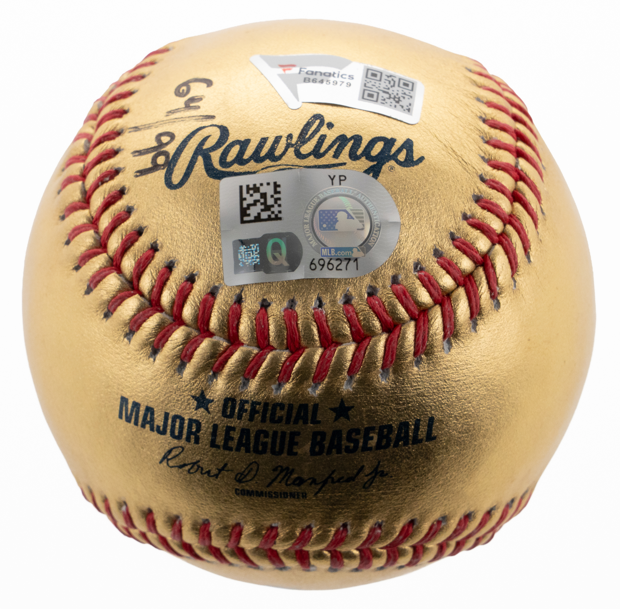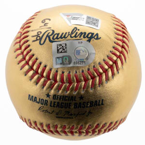 2022 was a golden year for Aaron Judge, surpassing Roger Maris's record of 61 home runs from 1961, making him the Yankees sole single season home run leader, and passing the AL single season home run record. Appropriately, this Gold Rawlings OML/Manfred Ball, 64/99 Limited Edition, is signed below the “Home Run” stamp by Aaron Judge (“8-9”). The ball has a Fanatics Sticker and Verification, as well as an MLB Sticker/Hologram. A perfect remembrance to a perfect season in a Fanatics ball box.