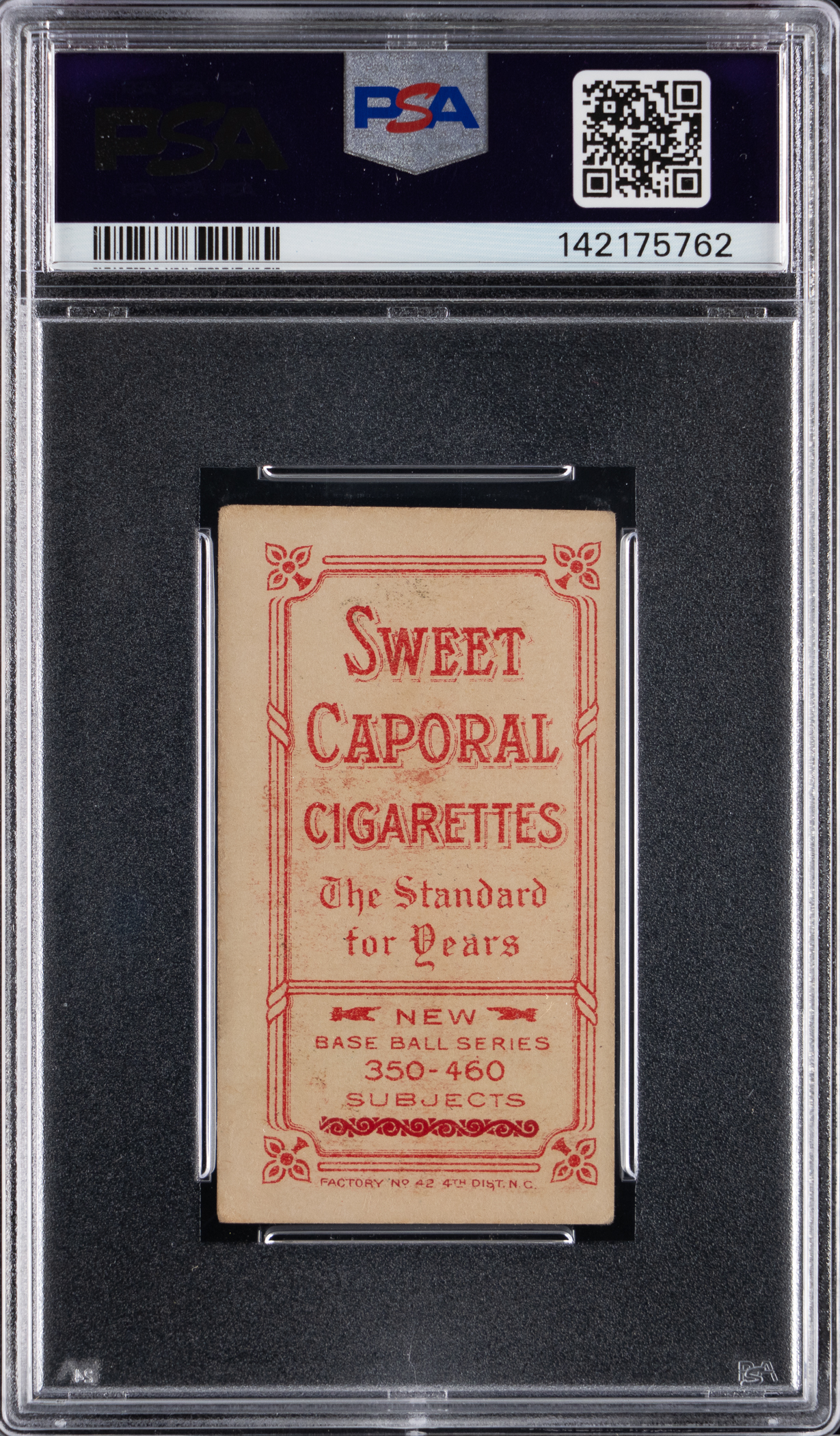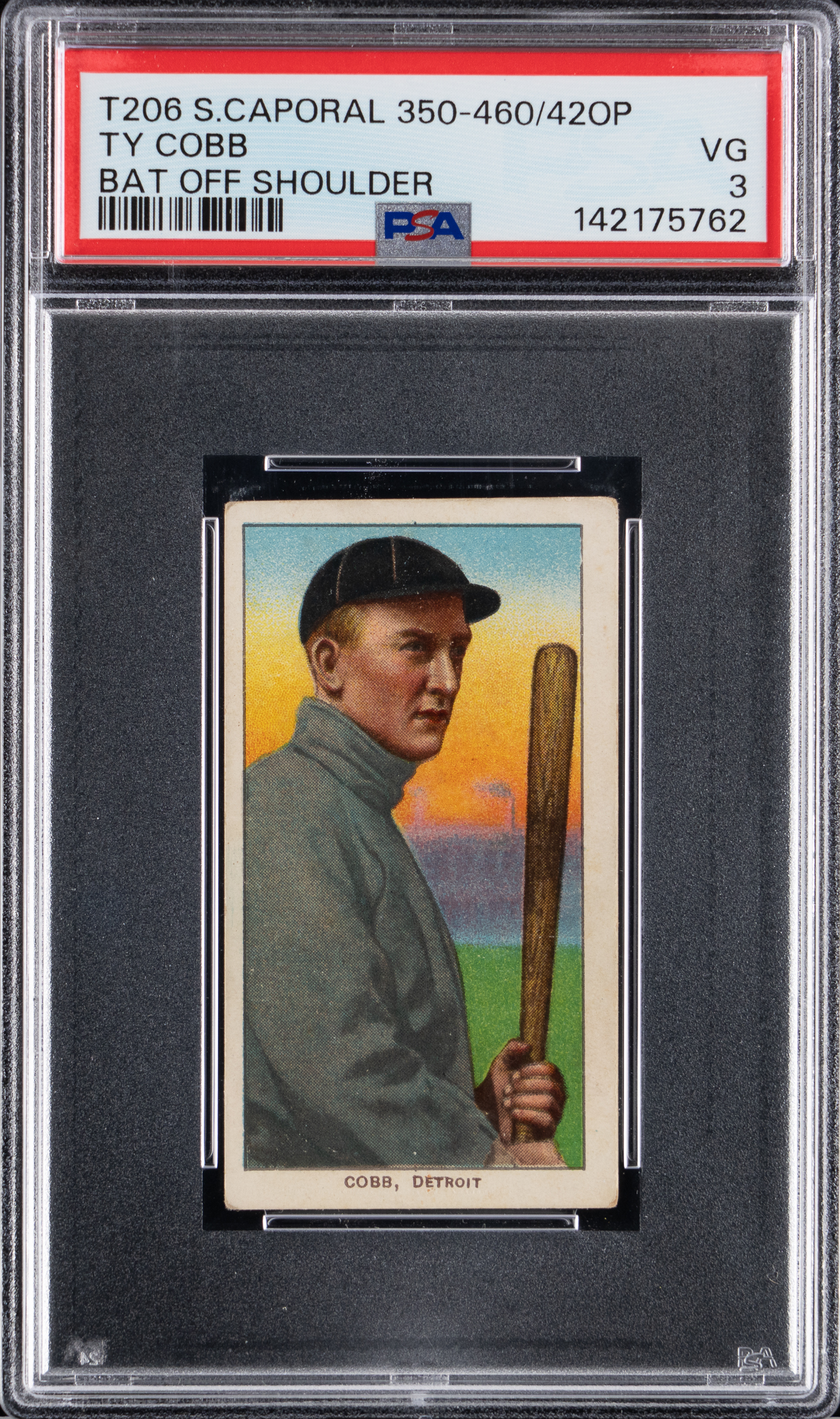 1936 Hall of Famer! Graded VG 3 by PSA with a Sweet Caporal 350-460 Subjects back. There are few tobacco cards hotter in the pre-war market than 1909-1911 T206 White Borders Ty Cobb poses. The offered "Bat Off Shoulder" rendering displays glorious eye appeal with intense surface color sequences and a clean reverse. The century-old foundation is crease-free and impacted by limited corner wear and only slightly errant left-to-right factory centering. Place a strong bid on this "Georgia Peach" before it soars further out of reach!
