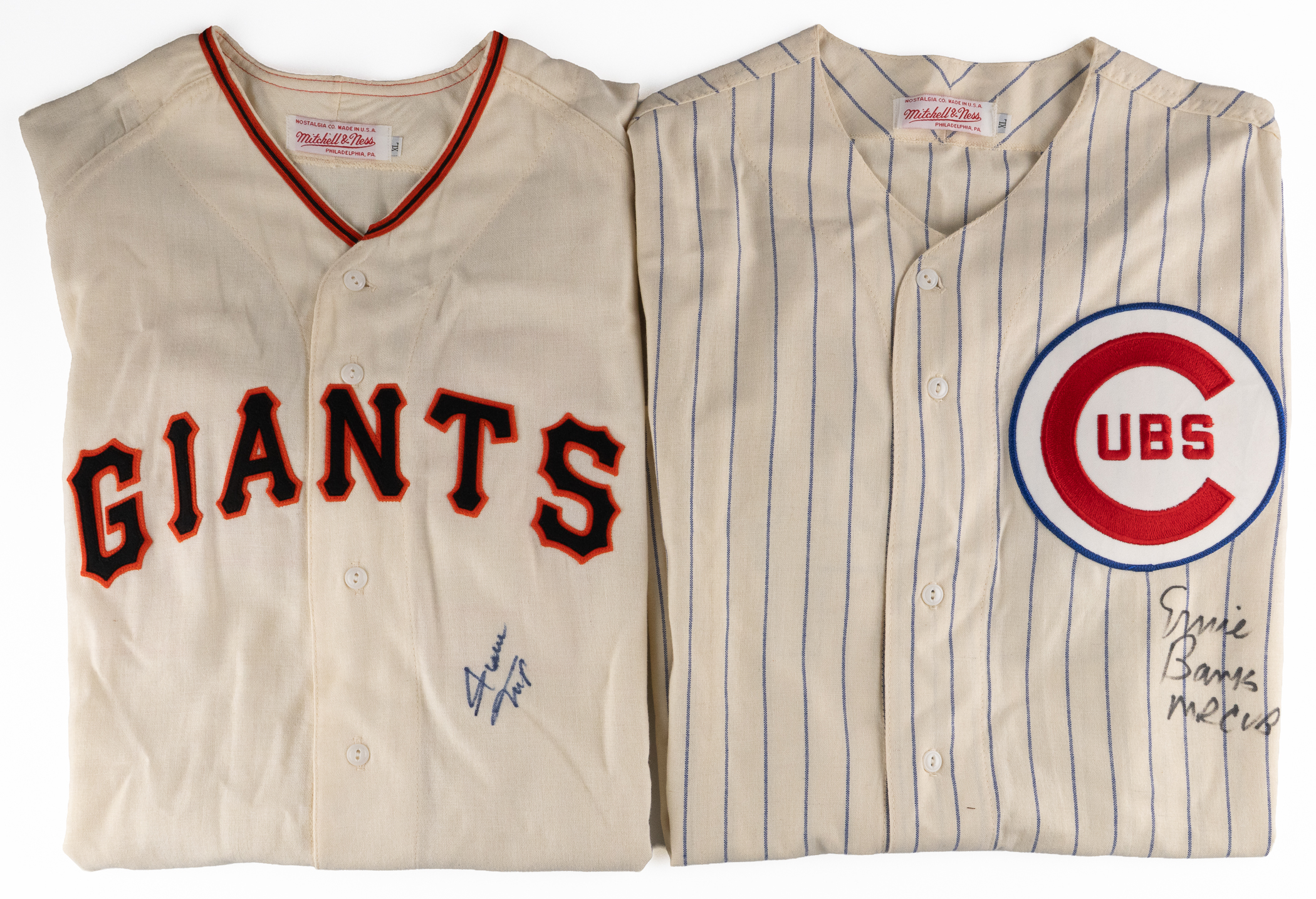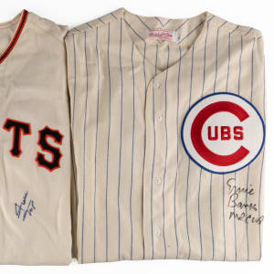 A total of 1,172 career home runs are represented with the offered pair of signed Mitchell & Ness Cooperstown Collection throwback jerseys. These size XL flannel garments were expertly recreated and boldly penned by their Hall of Fame subjects under the left breast section. Includes: 1.) Ernie Banks on Chicago Cubs pinstriped jersey with 100th Anniversary arm patch with Mr. Cub inscription and 2.) Willie Mays on Giants jersey. Auction LOA from James Spence/JSA.