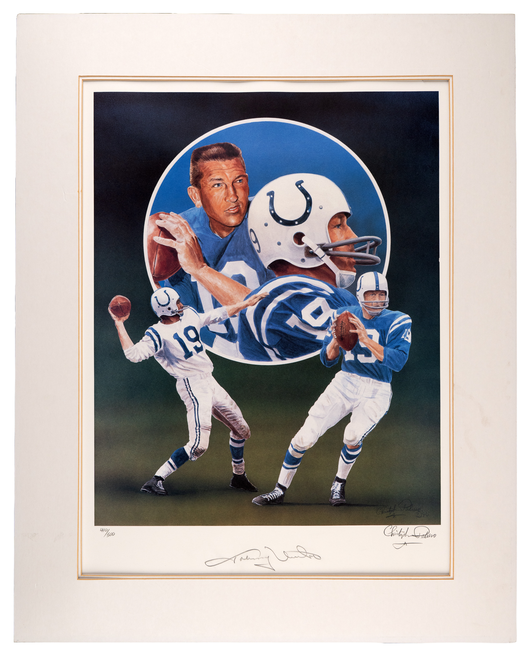1) Johnny Unitas signed 18x24 LE (410/500) lithograph (also signed by artist Peluso, matted to 23x29)