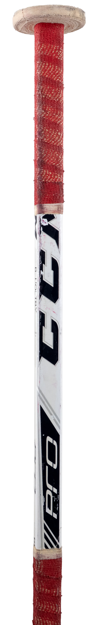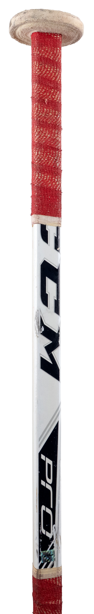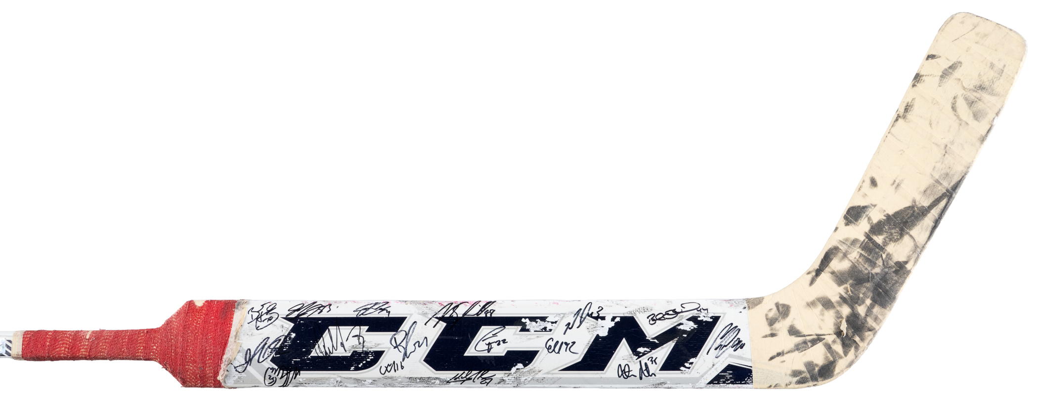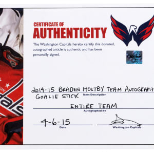 Celebrate an NHL 40-game winner, with this 2014-2015 Washington Capitals team-signed Braden Holtby game-used goaltender stick. This was Holtby’s breakout season, when he recorded his first of three consecutive 40-win seasons. Holtby was still in net during the 2018 playoffs, when the Caps won their first ever Stanley Cup championship. Abundant signs of authentic multi-game use are evident, including multiple puck contact marks on the blade of this CCM Pro model stick. “B. Holtby” is stamped on the shaft, and the taping pattern is consistent with Holtby’s style. Numerous images available in Getty’s archive confirm the style match of this seasoned gamer. A total of (16) bold signatures are located on the stick’s paddle section, with: Holtby, Ovechkin, Carlson, Beagle, Laich, Fehr, Schmidt, Alzner, Glencross, Kuznetzov, Wilson, Orpik, Peters, Johansson, Ward, and Green.