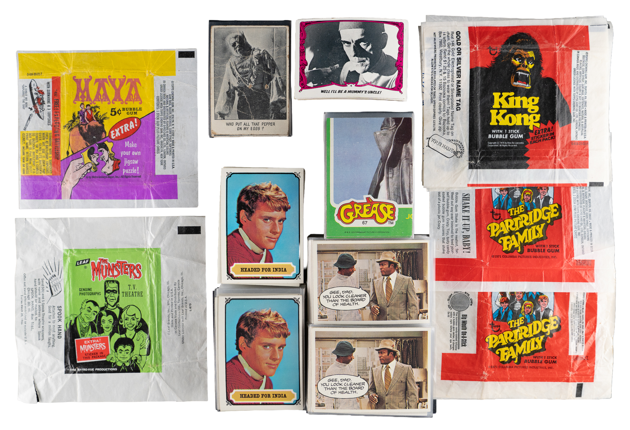 Wax Pack Wrappers: (23 wrappers, average EX to NM) with 1964 Leaf Munsters, 1964 Topps Beatles (creasing), 1964 Topps Beatles Color, 1964 Topps Beatles Movie (low-grade with tear), 1966 Fleer Three Stooges, 1967 Leaf Garrison’s Gorillas, 1967 Topps Maya, (4) 1971 Topps The Partridge Family, (5) 1977 Topps Star Wars (different series);