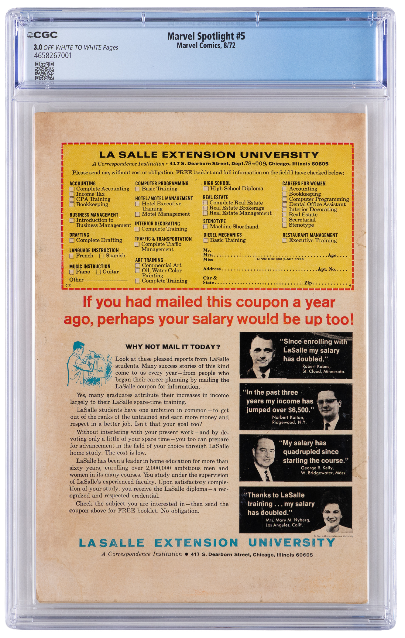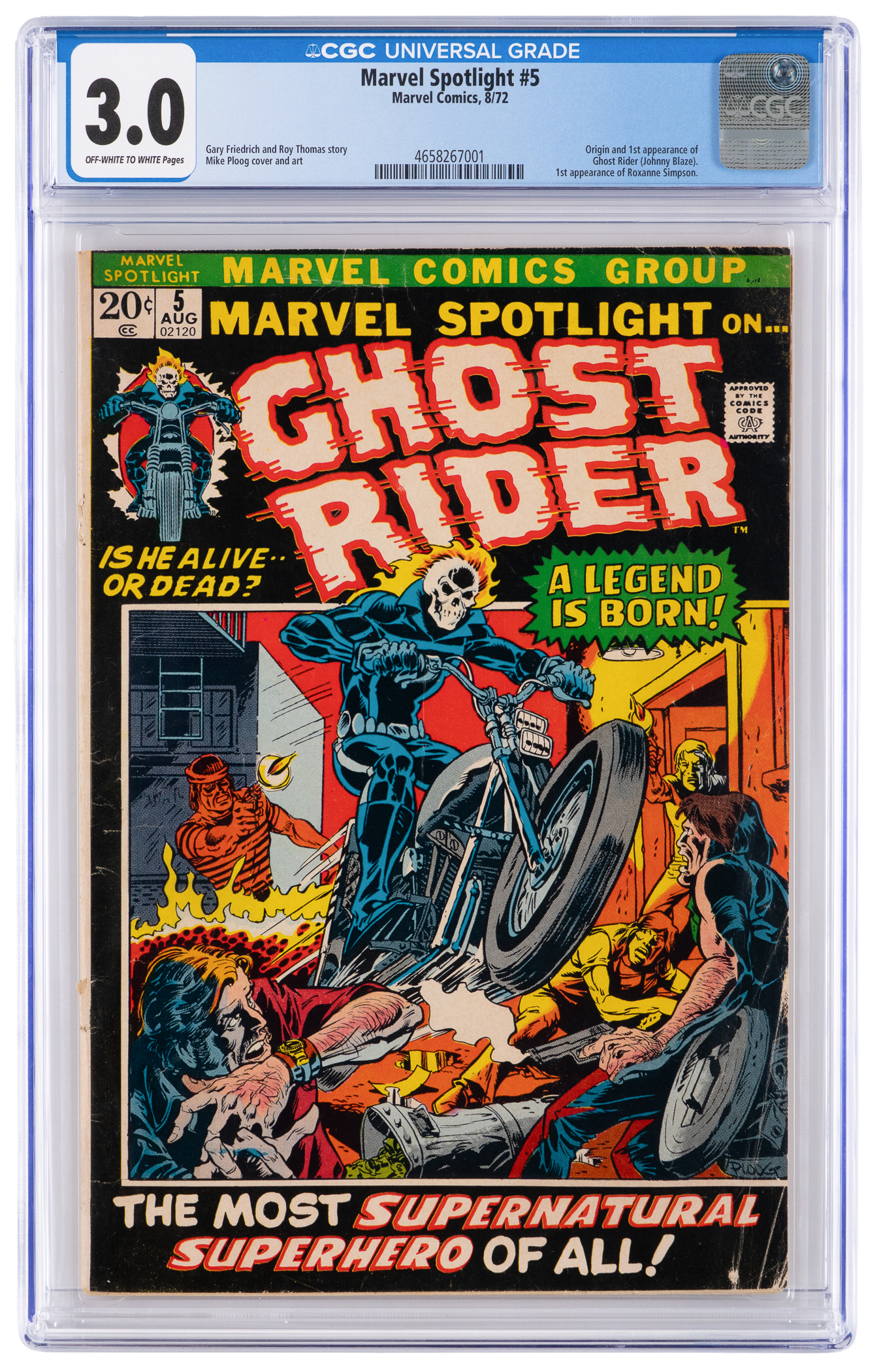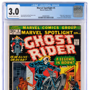 The Johnny Blaze/Ghost Rider character mounted up for his first comic book thrill ride in this 8/72 Marvel Spotlight #5 issue. While Marvel published a western Ghost Rider a few years earlier, stunt motorcyclist Blaze was the first Rider with a supernatural nature. Over the years, Ghost Rider has ridden a fiery trail to the top of the charts, earning hordes of devoted fans. CGC has encapsulated this early Bronze Age key first appearance issue with a grade of 3.0, Off-White to White Pages. Label notes are "Gary Friedrich and Roy Thomas story Mike Ploog cover and art. Origin and 1st appearance of Ghost Rider (Johnny Blaze). 1st appearance of Roxanne Simpson.".