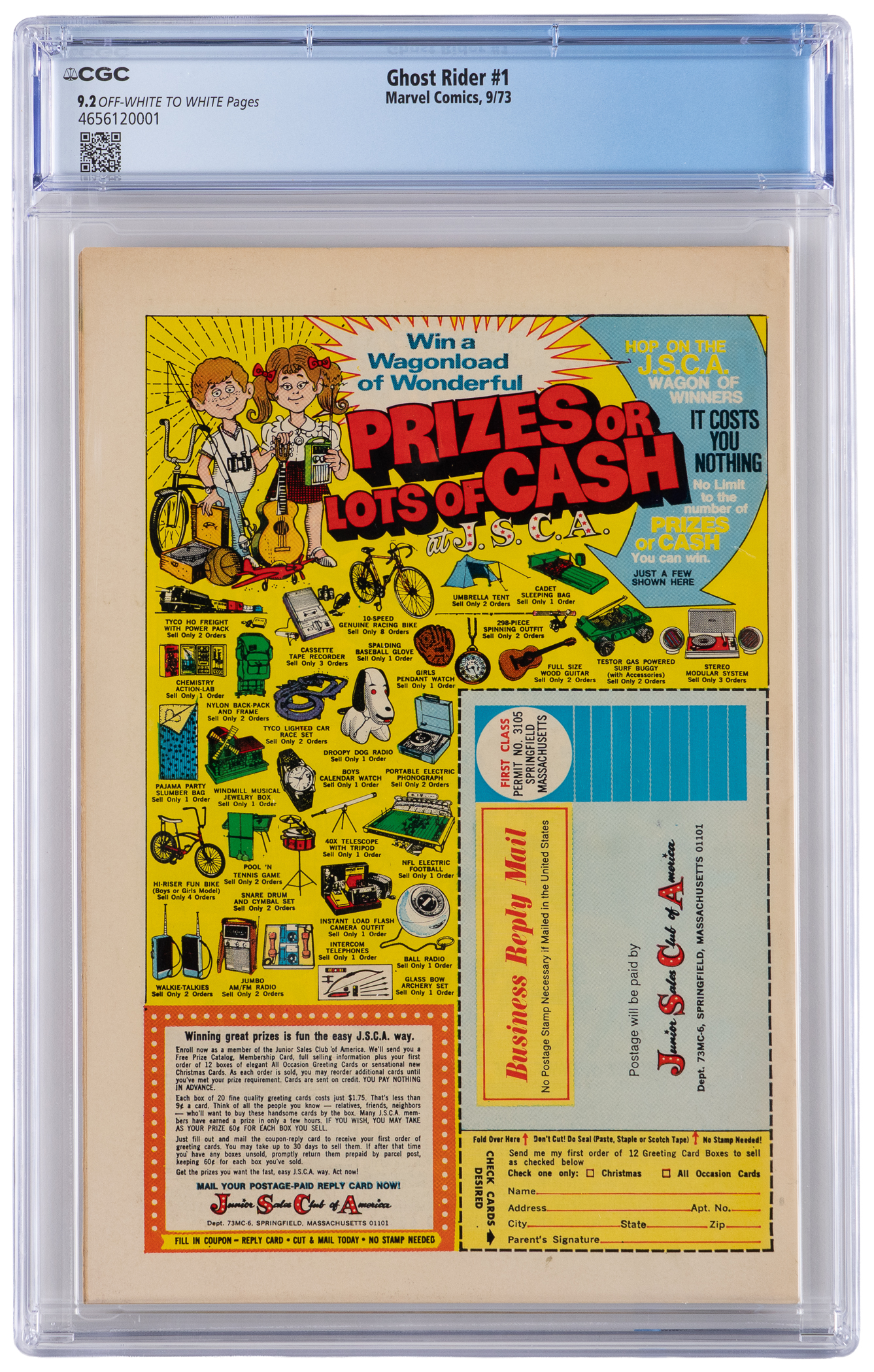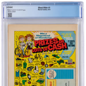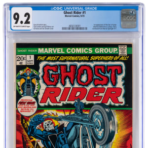 Rev up your bids for this 9/73 Marvel Ghost Rider #1 issue. Billed as "The Most Supernatural Superhero of All", the Johnny Blaze/Ghost Rider character debuted a year earlier, appearing in issues #5-11 of the prominent tryout series Marvel Spotlight. Topped with a flaming skull, the on-fire hero graduated to his own solo title with the offered #1 issue, which continues a story from Marvel Spotlight #11. This issue also marks the first appearance of Daimon Hellstrom/Son of Satan, who then followed Ghost Rider in Marvel Spotlight, appearing in issues #12-23. CGC has encapsulated this Ghost Rider #1 issue with a highly satisfying grade pf 9.2, Off-White to White Pages, making it a nice find for seekers of Bronze Age key issues. Label notes are "Gary Friedrich story, Tom Sutton and Syd Shores art, Gil Kane and Joe Sinnott cover. 1st appearance of the Son of Satan (Daimon Hellstrom) in cameo. Story continued from Marvel Spotlight #11".