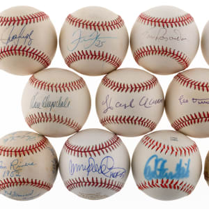 Leo Durocher, Don Drysdale, Ryne Sandberg “HOF O5” (etched), Tom Lasorda, Juan Gonzalez, Phil Niekro “Sally, my best wishes to you always - October 5, 1980” (lightly toned), Carlton Fisk.