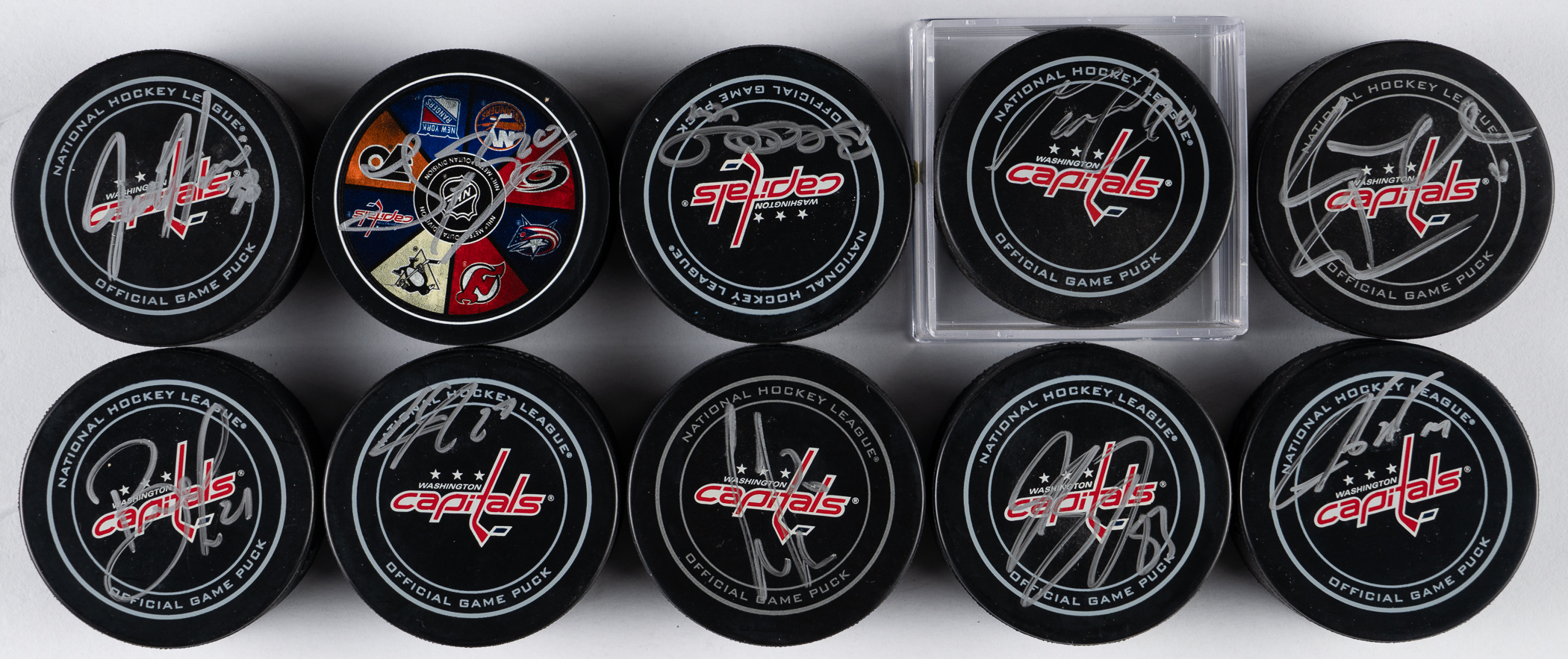 All are signed on “Washington Capitals Official Game Pucks” with silver marker. Signatures average (“8-9”).