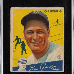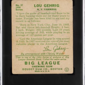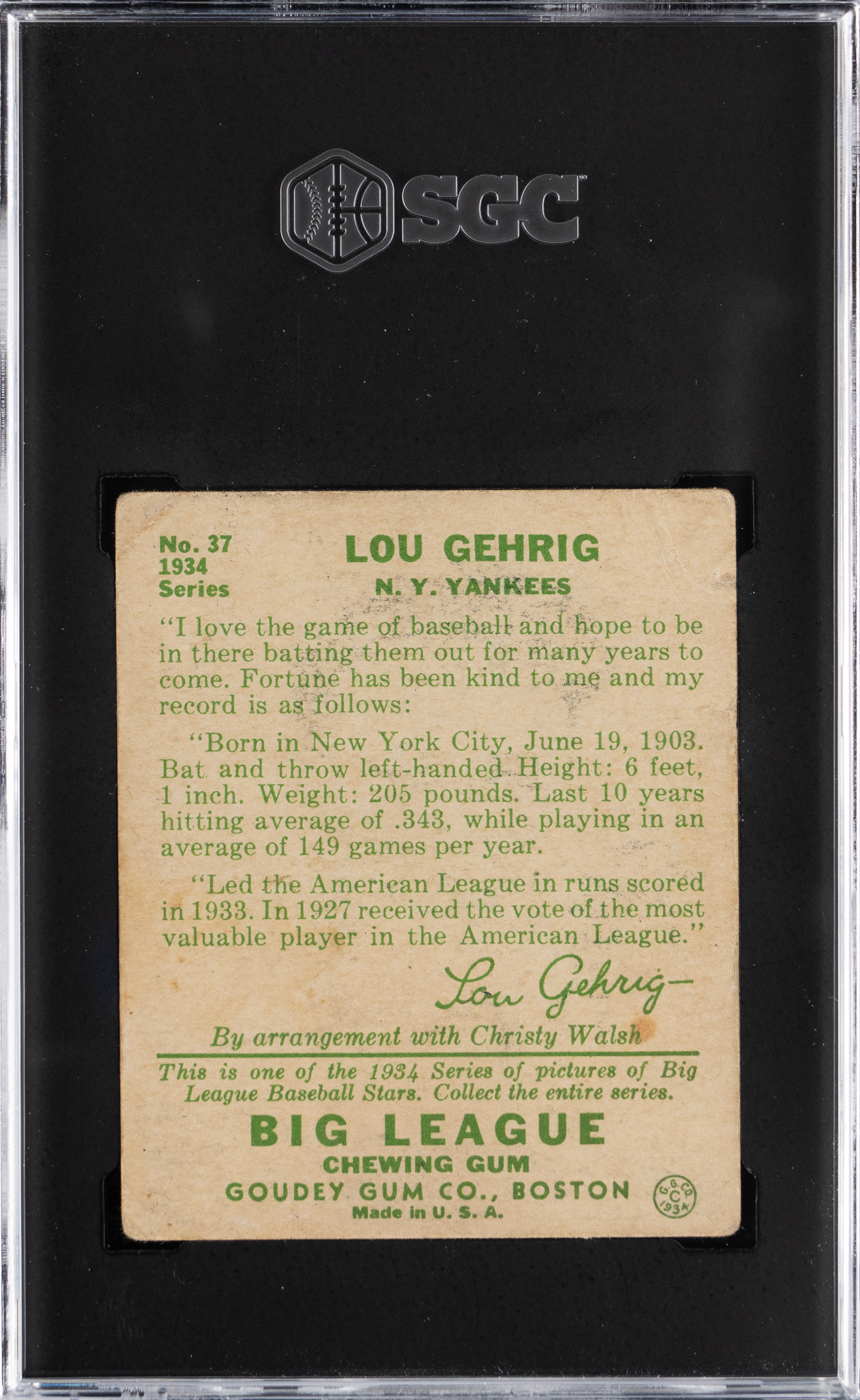 Graded FAIR 1.5 by SGC. With Babe Ruth fading into the twilight of his career, Lou Gehrig took over as "the face" of the New York Yankees machine. The offered 1934 Goudey #37 Lou Gehrig pictures the Hall of Fame slugger during a more light-hearted moment. Despite moderate corner/edge wear along with a series of creases throughout, this 92-year-old "Pride of the Yankees" still projects striking eye appeal. The player/uniform details are bright and the green text reverse is clean.
