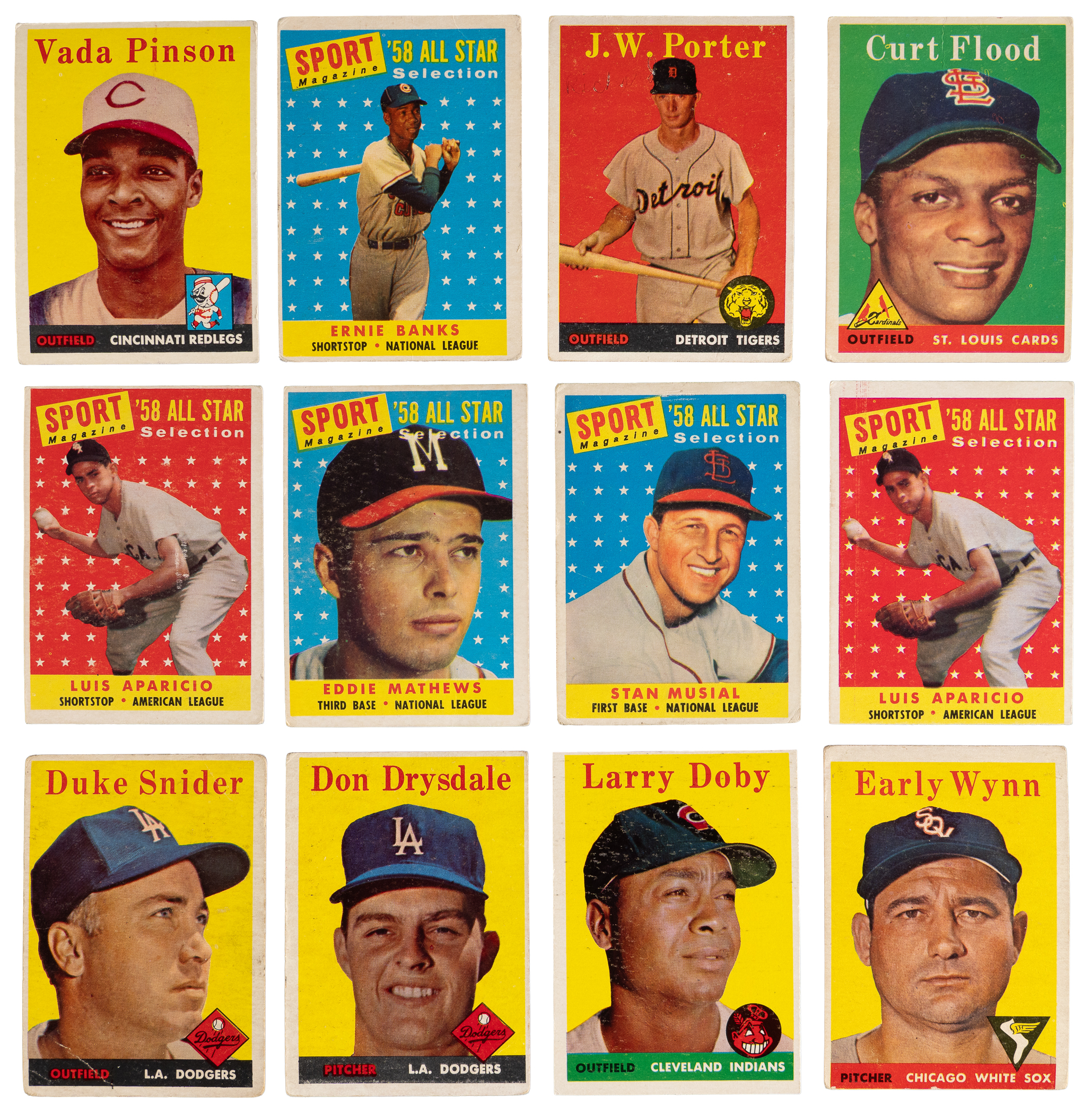 Large 1958 Topps collection of (750+) cards featuring a multitude of Hall of Famers and stars. This mixed grade assortment generally presents in the (GD to VG) range with several better and only a small percentage lesser. Highlights include: #25 Drysdale (GD), #32 Porter (FR, writing Yellow Name), #40 Kell (GD), #71 Dodgers Team (FR, erased writing), #88 Snider (PR), #100 Wynn (GD), #115 Bunning (PR, tape), #295 Minoso (PR, tear), #420 Pinson RC (VG), #424 Doby (VG), #464 Flood RC (GD), #476 Musial AS (GD), #480 Mathews AS (VG), #482 Banks AS (FR) and (2) #483 Aparicio AS (VG, GD).