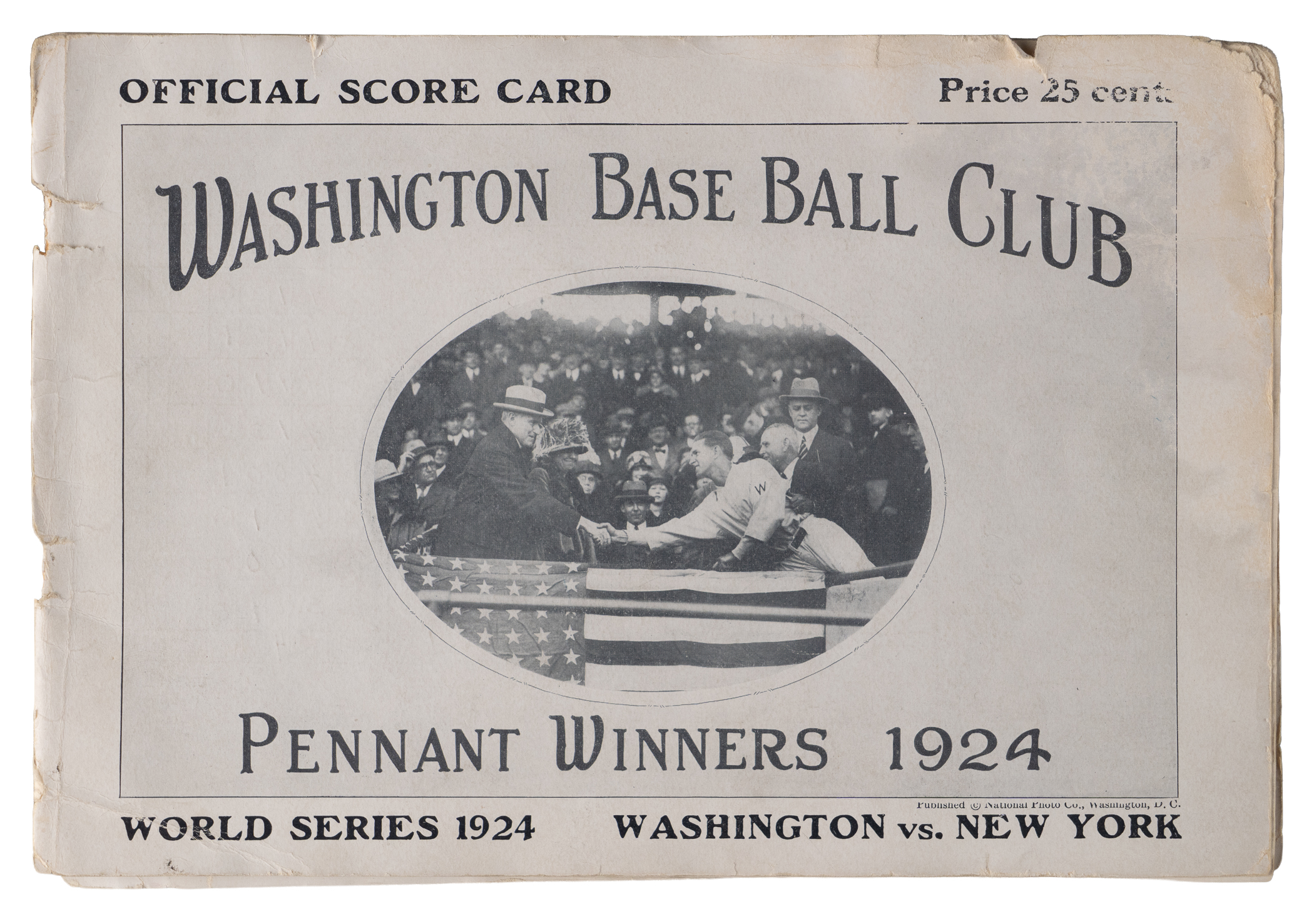 Washington Senators’ Roger Peckinpaugh gave the hometown fans at Griffiths Stadium a thrill with a walk-off double in the 9th inning to defeat the New York Giants 4-3 in the second game of the 1924 World Series. This 7x10 program is scored for Game 2 on the inside of the front and back covers, showing Peckinpaugh’s winning hit. The rest of the program is occupied with photos of the players, teams and managers. The front and back covers of the program are unattached, as are the two center pages. Overall, the condition is Fair to Good.