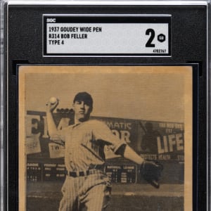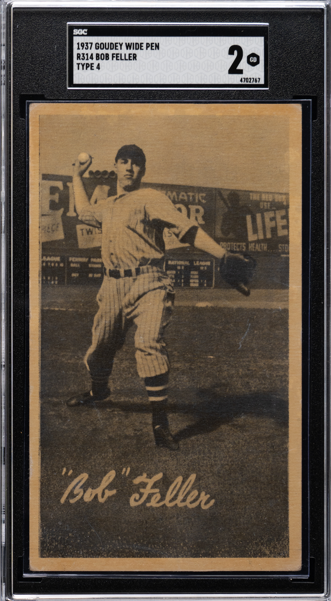 Graded GOOD 2 by SGC. "The Heater from Van Meter" dominates with the offered 1937 R314 Goudey Wide Pens Type 4 Bob Feller rookie example. The future Cleveland Indians Hall of Fame fireballer is cleanly portrayed as he readies to unleash another wicked fastball in a period ballpark setting!