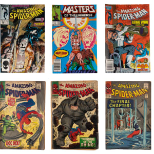 Numerous publishers are represented with issues from a variety of genres, in this comic book treasure chest bundle (200+). The great majority of these vintage comics date from the 1960s-1980s, though there are a few from the 1990s, and at least one from the 1950s. Headliners are a half-dozen original Amazing Spider-Man first series issues, including the first appearance of the Rhino, and more than two dozen #1 issues, including (6) 1986 Masters of the Universe in pleasing condition.
