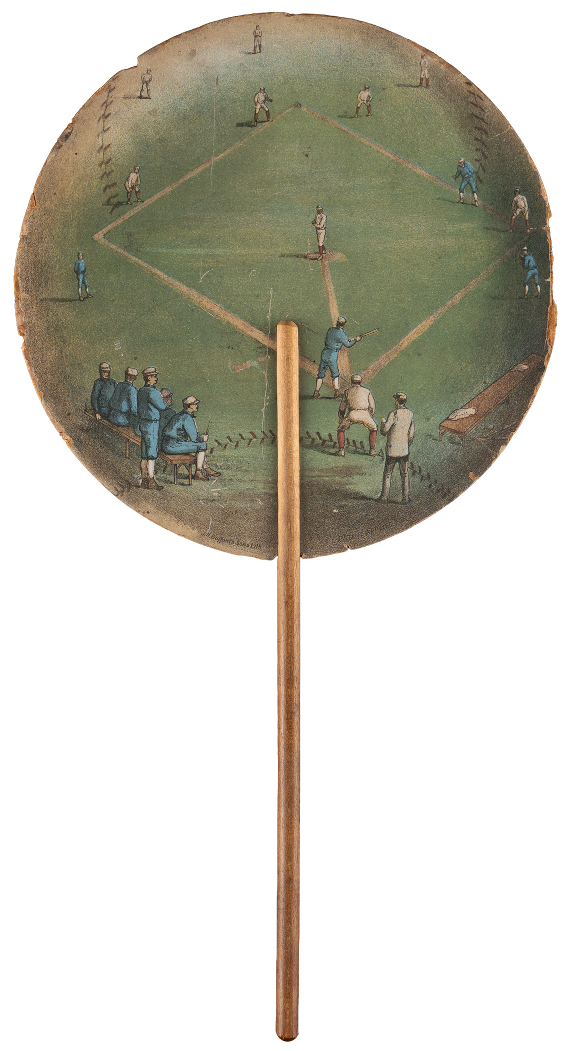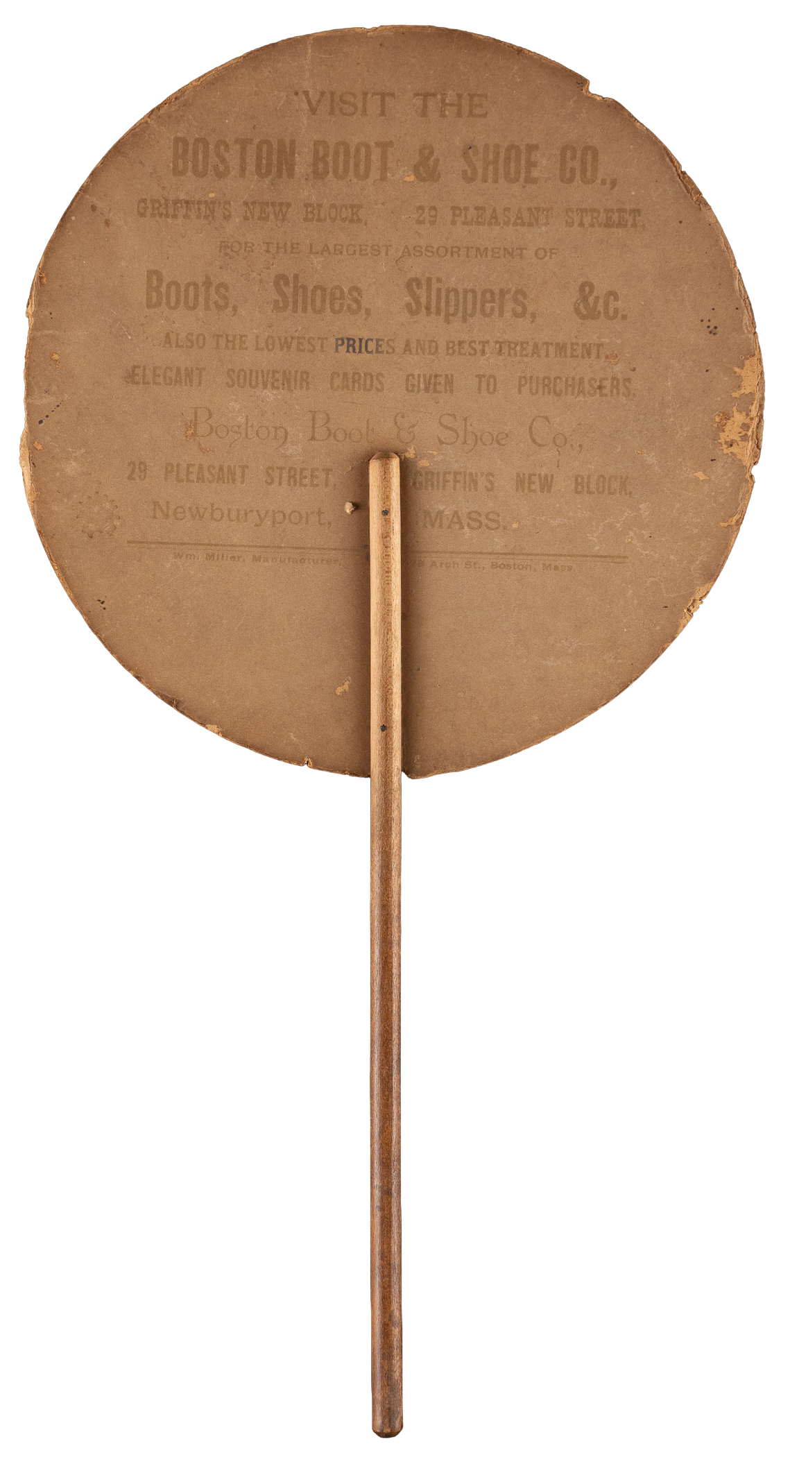 Cool off with this antique advertising giveaway baseball fan. This circa 1880s cardboard fan is printed with J.H. Bufford Sons Litho at bottom on the obverse. Depicting a baseball game in progress, this 19th Century treasure has a 7-1/2" diameter and is attached to a 9-1/2" wand. Styled as a baseball dream scene complete with stitches, the obverse artwork is a visual delight. Printed on the reverse is extensive advertising copy for the Boston Boot & Shoe Co., of Newburyport, Mass. Authentic period appeal is ample, and overall wear is age-appropriate, including a moderately chewed up perimeter.