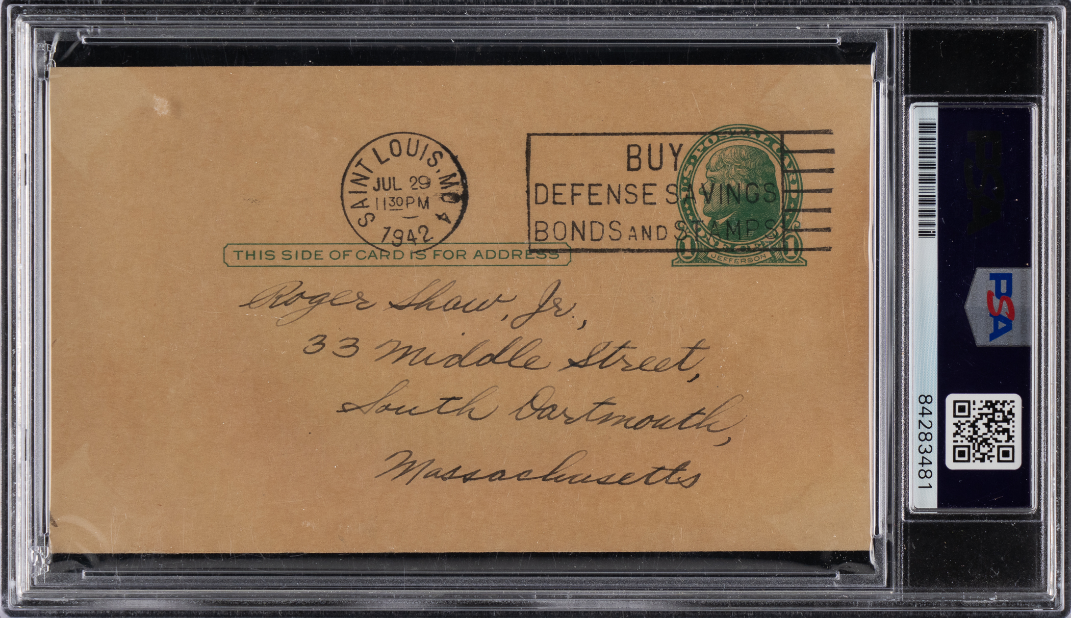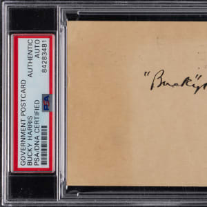 Bring a long-deceased Hall of Famer into your collecting fold, when you score this "Bucky" Harris signed government postcard. In a sign of the times, this WWII era souvenir is postmark-dated July 29, 1942, with a Buy Defense Savings Bonds and Stamps cancellation stamp from a St. Louis post office. Harris was serving as manager of the Washington Senators at the time and their schedule had them facing the St. Louis Browns when Harris returned this GPC to a South Dartmouth, Massachusetts fan. Harris' steel-tip fountain pen signature remains bold and appealing.