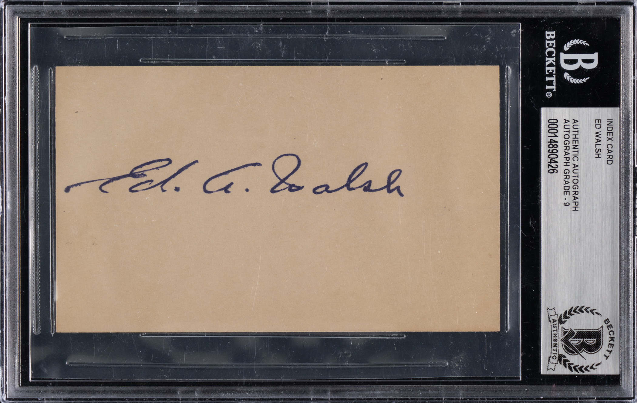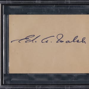 An elusive Hall of Fame signature is spotlighted, with the offering of this Ed Walsh signed index card. A spitball specialist, Walsh was one of the top pitchers of the dead ball era. His best campaign came in 1908, when he posted baseball's last 40-win season, while taking the mound for an astonishing 464 innings. Walsh (HOF, d.1959) delivered the goods when he provided this bold fountain pen signature.