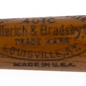 Ripe for the picking, is this circa 1910s Ty Cobb Georgia Peach decal bat. Sized at 22” in length, this antique souvenir is a Louisville Slugger mini-bat decorated with a magnificent decal of Cobb standing atop a peach, in batting pose. A facsimile signature is located over his pinstriped pants and printed between his legs is the legend “Broke All Batting Records With Louisville Slugger”. Seen over the peach is Cobb’s nickname “Georgia Peach" in stylish font. The bat reports in excellent condition, and though the decal suffers scattered bits of loss, it is remains highly appealing.