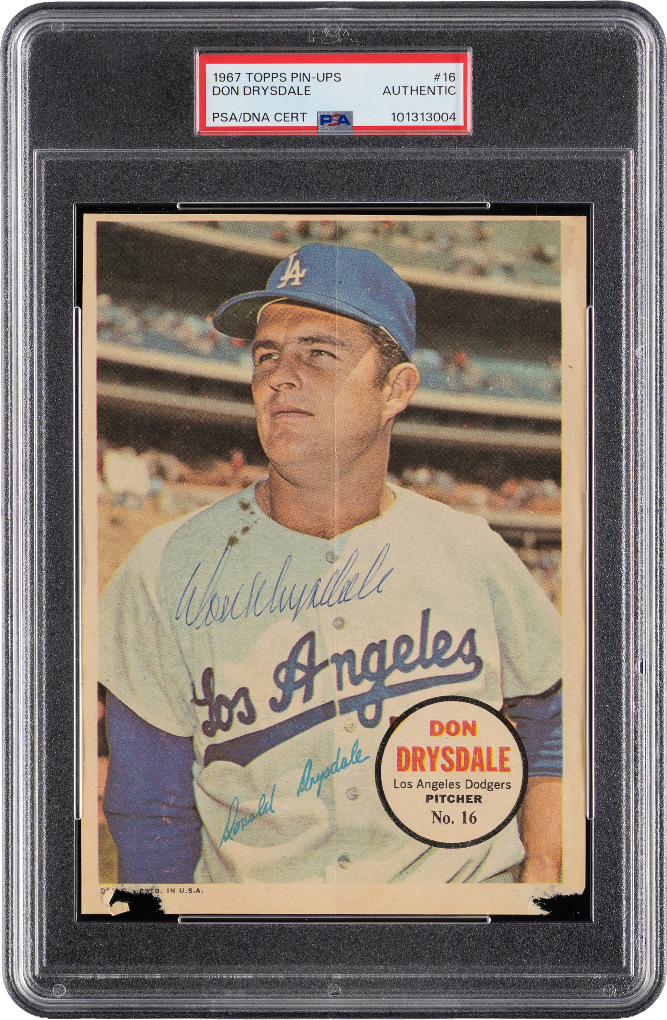Fierce competitor Don Drysdale made his mark with the signing of this 1967 Topps Pin-Ups #16 poster. The Brooklyn/Dodgers Hall of Fame hurler also left a lot of marks on opposing batters, racking up a career total of 154 hit batters, on his way to an impressive 209-166 record. From a popular Topps wax pack insert series, this vintage poster suffers some surface loss on the bottom border but remains attractive. Drysdale has signed neatly in Dodgers blue, above the letters on his jersey. Encapsulated by PSA/DNA with an Authentic designation.