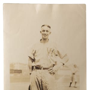A ballplayer has to start somewhere, and for "Gabby" Hartnett it was with the Worcester Boosters. The Hall of Fame backstop is seen here in his 1921 Boosters uniform, in this 3-1/8" x 5-1/8" photograph. The young catcher didn't need much time in the minors. His talent was such that after a single season in the Eastern League, he was picked up by the Chicago Cubs for the 1922 season. After nineteen solid seasons with the Cubs and a final MLB season with the New York Giants, Hartnett was considered the best catcher in National League history, until Johnny Bench came along. Despite a detached but included corner at the top-right, this antique photograph remains appealing, showing Vg details.