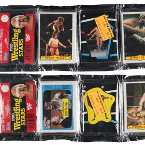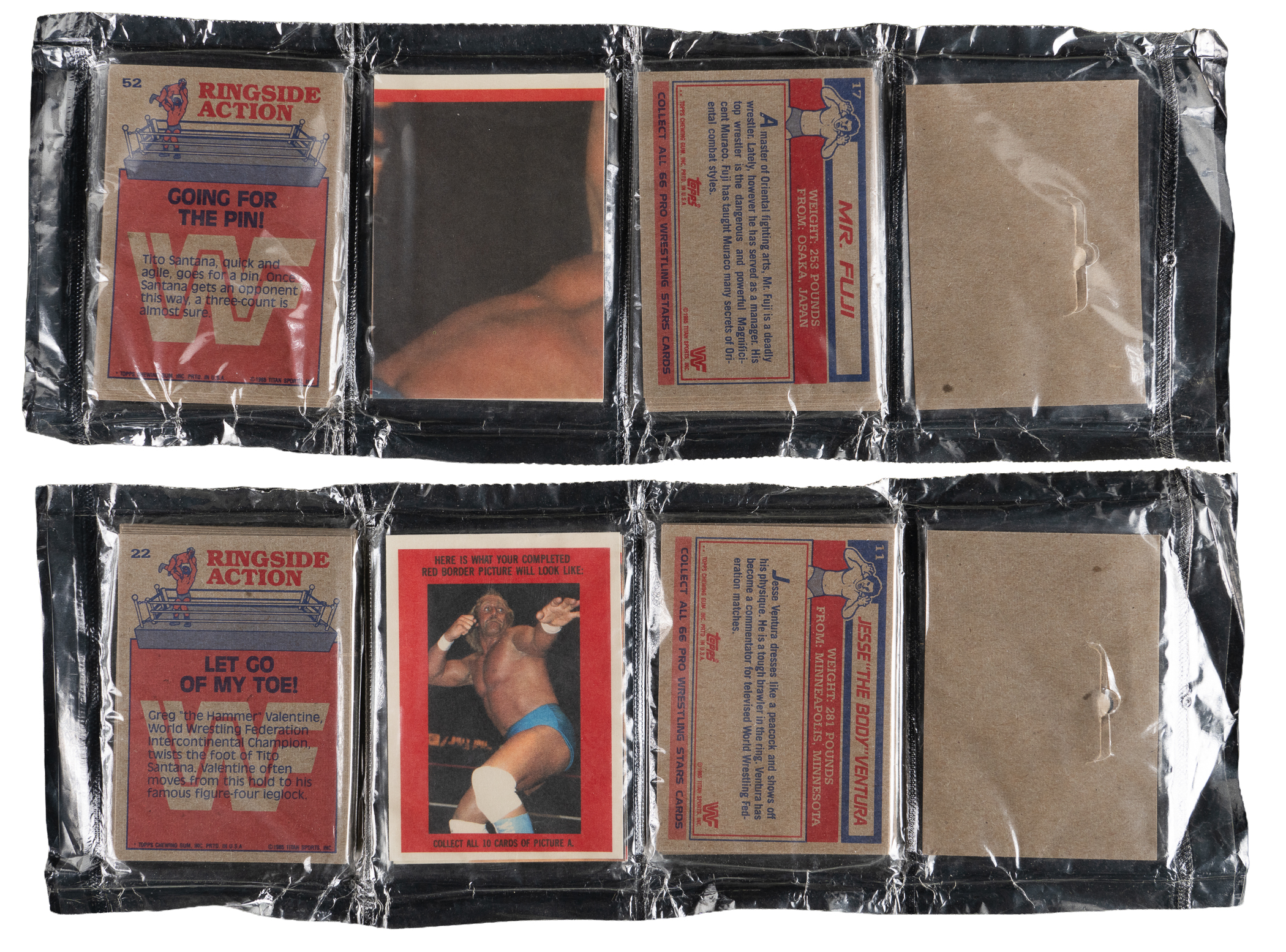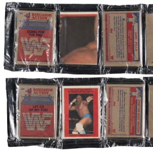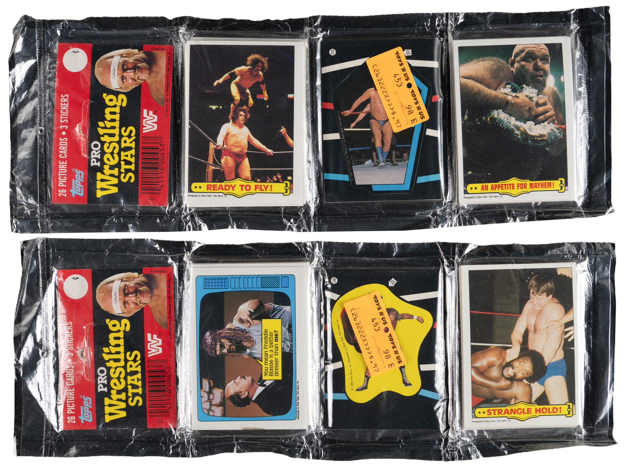 Turnbuckle terrors claw their way to the top with the offered pair of 1985 Topps WWF Pro Wrestling Stars unopened rack packs. Each incredibly scarce rack includes 26 picture cards and 3 stickers. Not bad for a set that only contains 66 cards! Some of the grapplers found on the fronts/backs include Andre The Giant, George "The Animal" Steele and Jesse Ventura. With exception to price stickers affixed on each front, these 40+ year old survivors otherwise present high-grade.