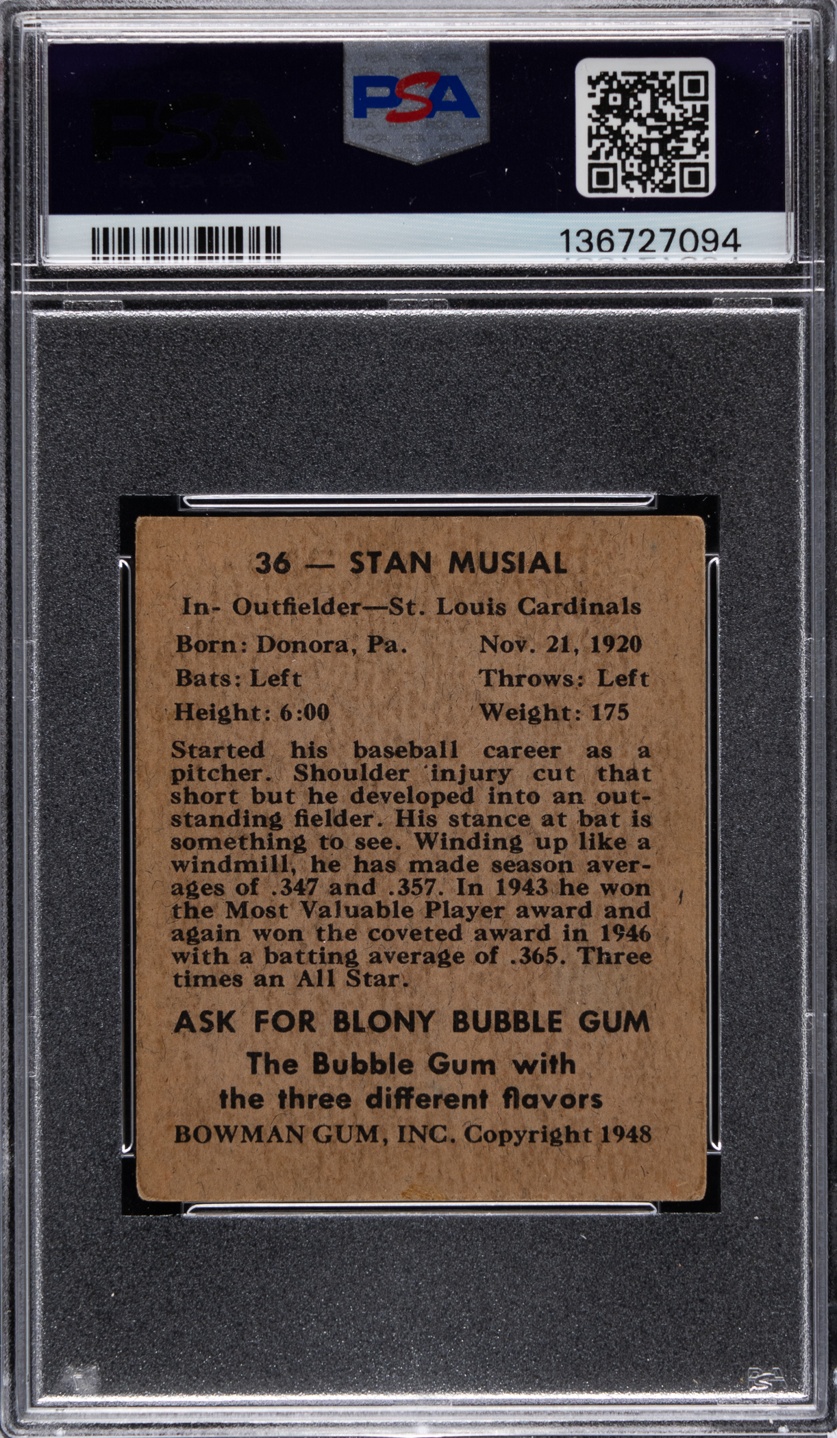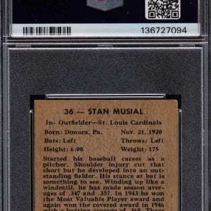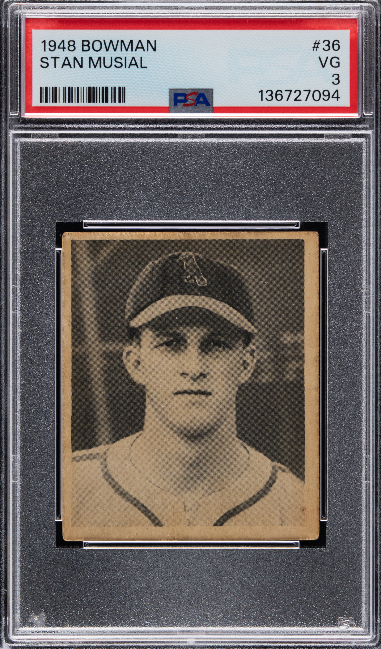 Graded VG 3 by PSA. St. Louis Cardinals faithful will desire the offered 1948 Bowman #36 Stan Musial rookie card. This black-and-white portrait of the Hall of Famer is especially clear with a crease-free surface and clean back. Moderate corner wear and slight perimeter foxing does not significantly impact this Hall of Famer's overall presentation.