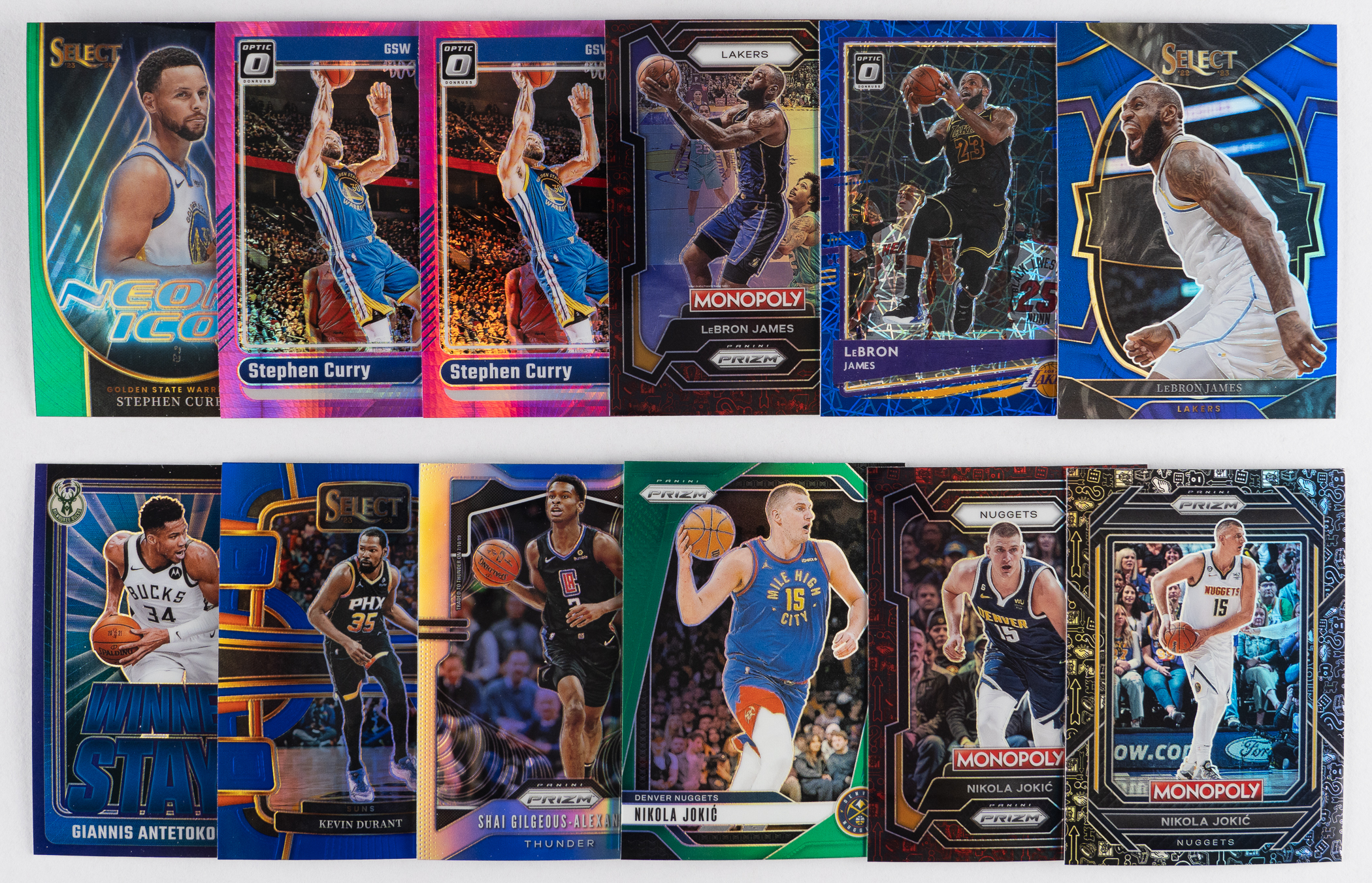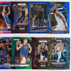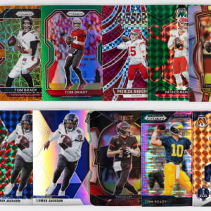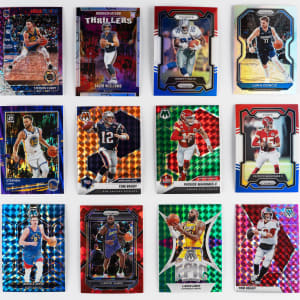 No Base Cards! Shiny modern football and basketball Prizm parallel collection of (2,500+) cards with several stars. This high-end Panini brand mixture features Hoops, Mosaic, Optic, Prizm and Select. A strong lineup of modern superstars are present including: Football: (1,625+ cards) with Brady, L. Jackson, Mahomes II, E. Smith, C. Williams; Basketball: (875+ cards) with Antetokounmpo, Curry, Doncic, Durant, Gilgeous-Alexander, L. James, Jokic and many more! The size/weight of this item requires that there will be an additional shipping charge for this lot.