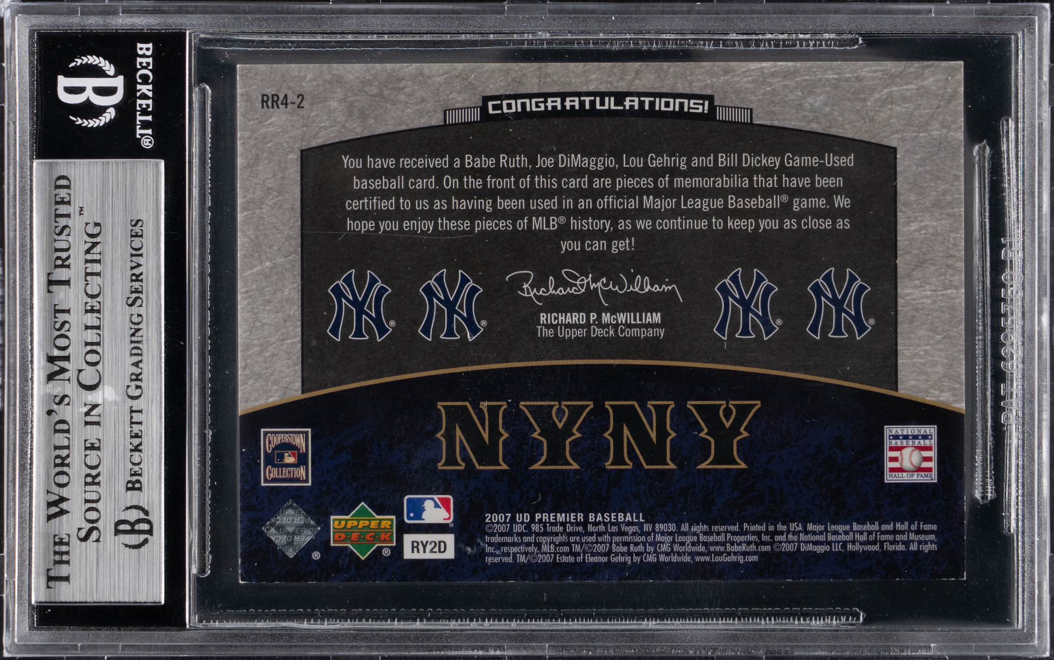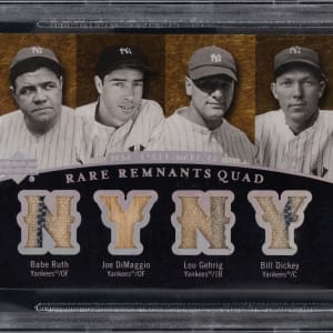Graded NM-MT+ 8.5 by BGS and serially numbered #1/1. A true modern masterpiece is delivered with the offered 2007 Upper Deck Premier Rare Remnants Quad featuring New York Yankees Hall of Famers Babe Ruth, Joe DiMaggio, Lou Gehrig and Bill Dickey. This one-of-a-kind quartet features sizable chunks of verified game-used memorabilia from the leading men of the 1930s Bronx World Series dynasty! All three of the uniform pieces including Ruth, Gehrig and Dickey showcase pinstripes while DiMaggio is a bat piece. One of the absolute tip-top pulls available in the high-end product line.