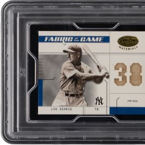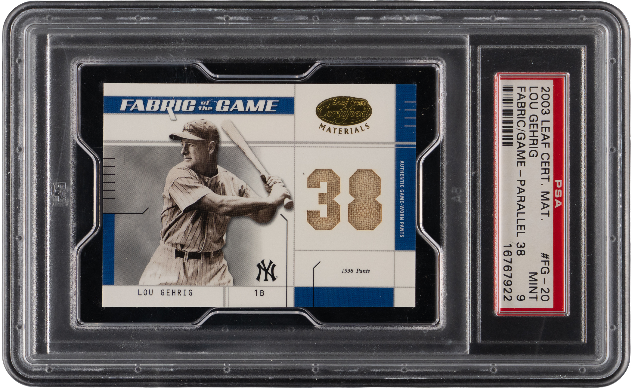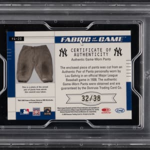 Graded MINT 9 by PSA and serially numbered #32/38. Own a piece of Lou Gehrig's game-used pants from the 1938 season with the offered 2003 Leaf Certified Materials Fabric of the Game modern insert. This sizable swatch presents high-grade and a picture of the soiled artifact is found on the reverse.