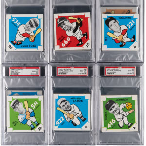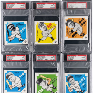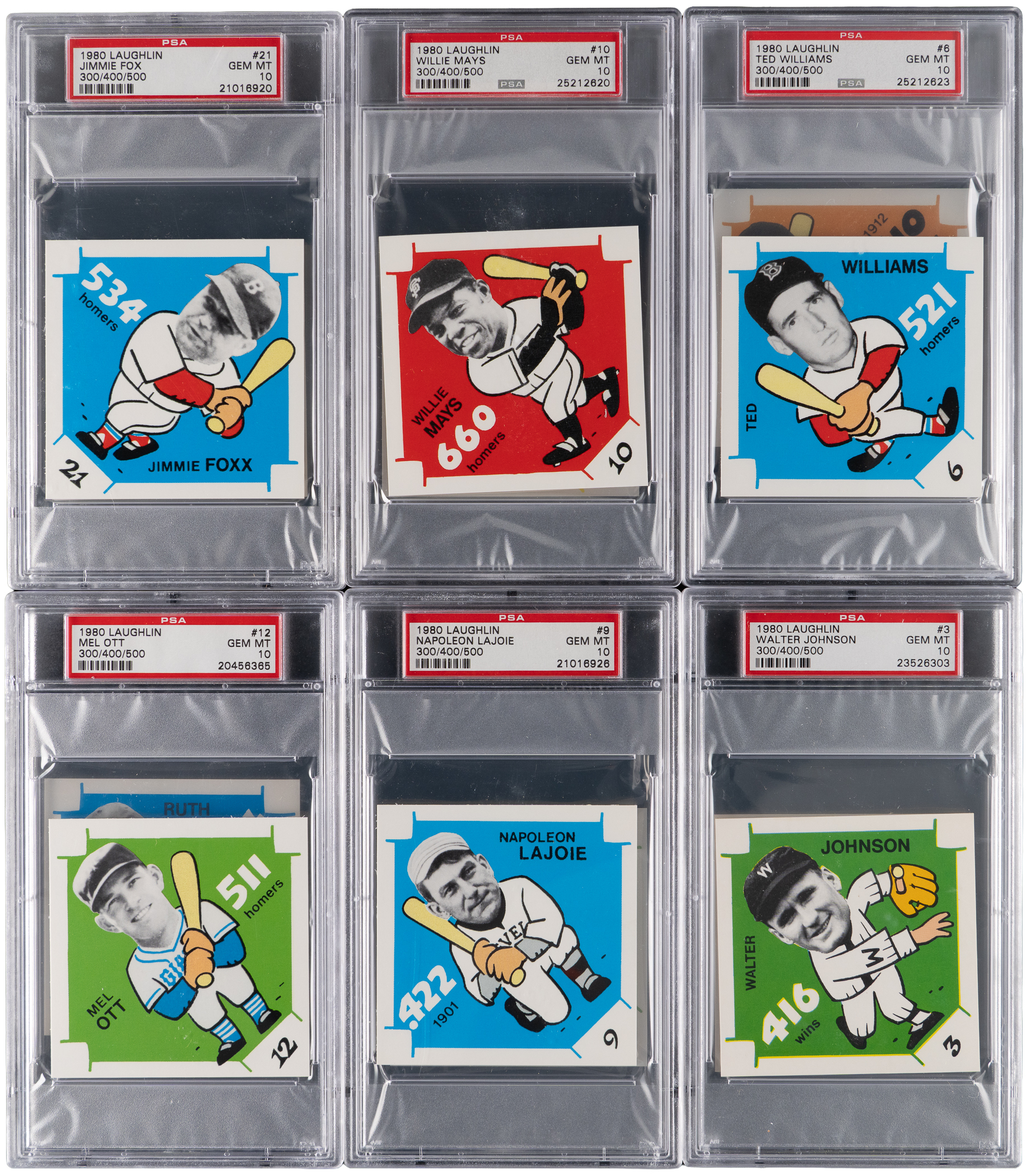 Acclaimed benchmarks in MLB history and those select few who reached them are the focus of this high-grade 1980 Laughlin 300/400/500 PSA graded complete set of (30) cards. Includes: GEM MINT 10: (22 cards) with #1 Header, #3 W. Johnson, #4 Cobb, #6 T. Williams, #8 Alexander, #9 Lajoie, #10 Mays, #11 C. Young, #12 Ott, #13 J. Jackson, #15 Spahn, #18 Mantle, #19 Grove, #21 Foxx, #22 Plank, #23 F. Robinson, #24 Sisler, #25 Mathews, #26 Wynn, #27 Banks, #29 Gehrig, #30 McCovey; PSA MINT 9: (8 cards) with #2 Ruth, #5 Mathewson, #7 Terry, #14 Killebrew, #16 Aaron, #17 Hornsby, #20 T. Williams and #28 Heilmann.