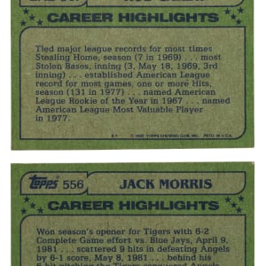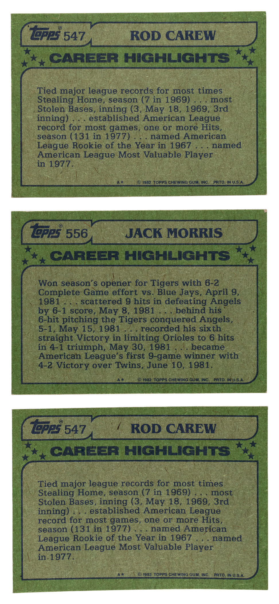 The offered trio of 1982 Topps Hall of Fame "Blackless" variations includes the following legends: 1-2.) (2) #547 Carew AS (NM, EX) and 3.) #556 Morris AS (NM).