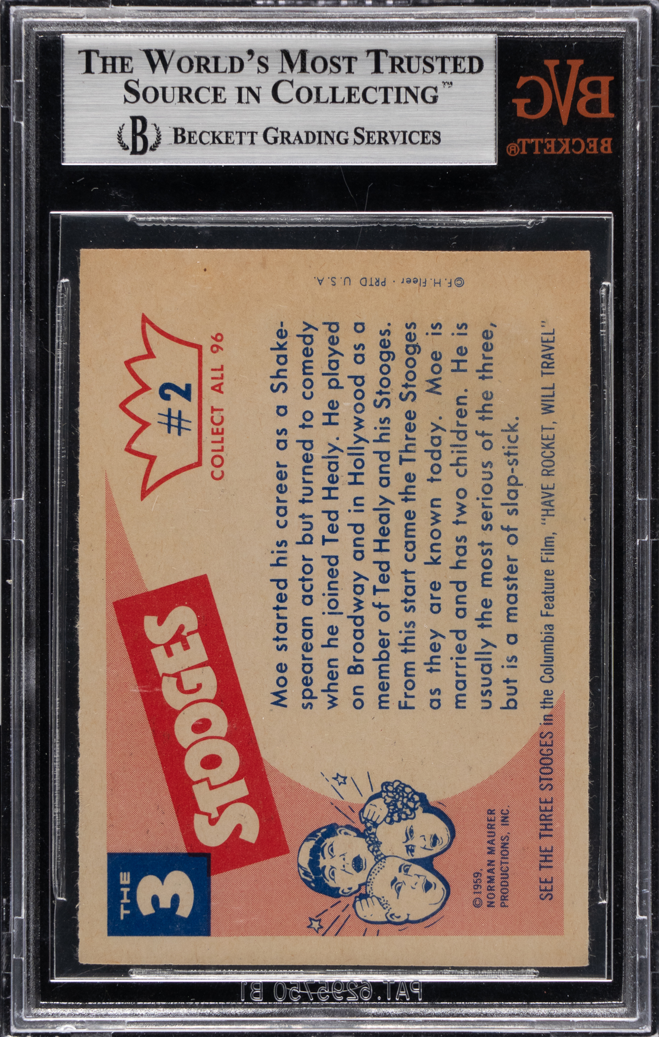Graded MINT 9 by BVG. Although “Moe” does not appear happy to reside on this high-grade 1959 Fleer Three Stooges #2 single, the savvy non-sport set specialist will definitely find tremendous value in it! This “pack fresh” specimen meets all the criteria for the technical grade including pinpoint centering, well-constructed corners, crisp edges and a sparkling cream reverse.