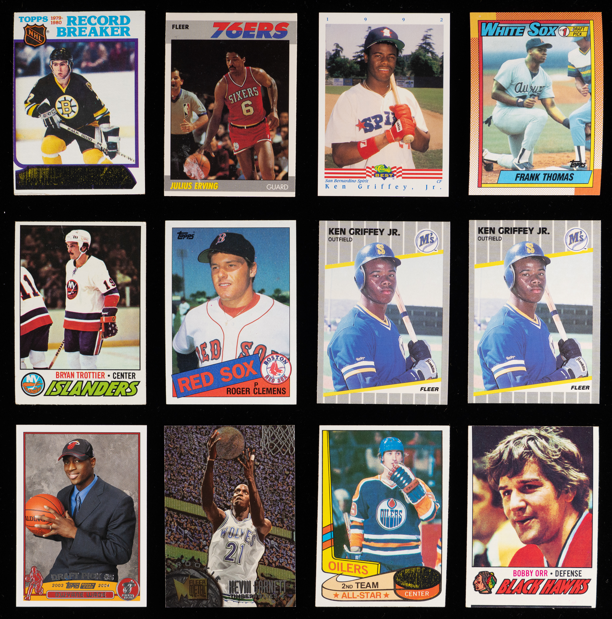 Baseball Stars: (35 stars, average NM) with 1980 Topps #482 Henderson RC (EX-MT), 1985 Topps #181 Clemens RC (EX-MT), 1989 Fleer: (2) #548 Griffey Jr. RC (both NM), #616 B. Ripken ERR (EX-MT), 1990 Score #697 B. Jackson (EX-MT), 1992 Classic Draft Picks #6 Jeter (NM), 1993 Classic Best #91 Jeter RC (NM), 1993 Topps #98 Jeter RC (NM-MT), 1994 Fleer Pro Cards #633 Jordan (NM);