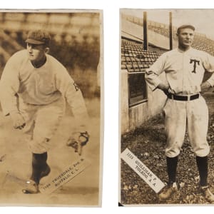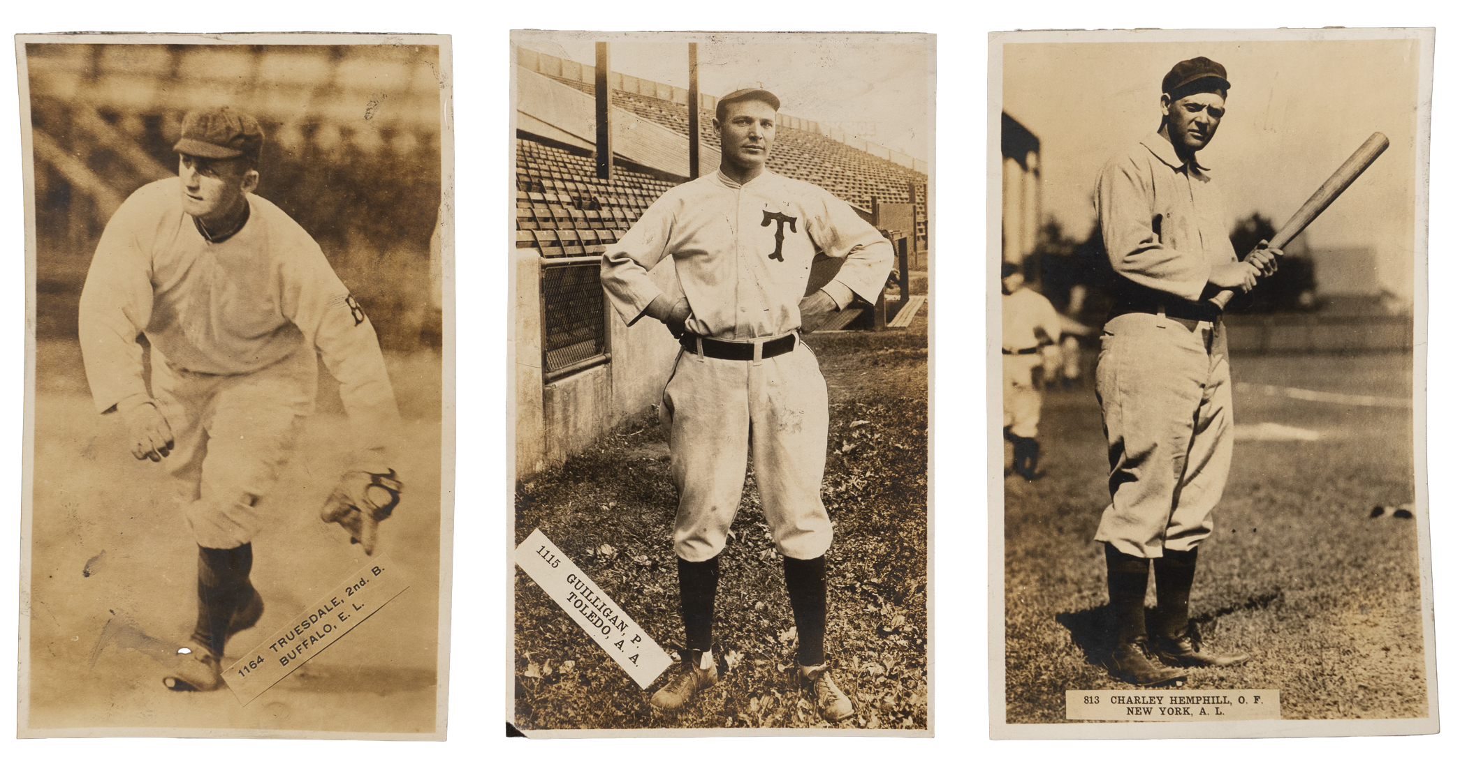 Offered is a trio of 1911 T911 T5 Pinkerton unmounted cards. Measuring nearly 3-1/2 x 6," these sepia-toned artifacts are printed on thin paper stock and display only minor front creasing or crazing. The reverses are attached with a black paper backing. Subjects include: 1.) #813 Hemphill; 2.) #1115 Guilligan (Toledo) and 3.) #1164 Truesdale (Buffalo).