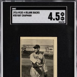 Graded VG/EX+ 4.5 by SGC. Ray Chapman of the Cleveland Indians is portrayed just four years prior to the unfortunate pitch that claimed his life on the offered 1916 M101-4 Sporting News #30 example. This black-and-white blank back is quite clean with razor-sharp corners, clean edges and a problem-free back. Factory errant centering prevents a higher technical assessment.