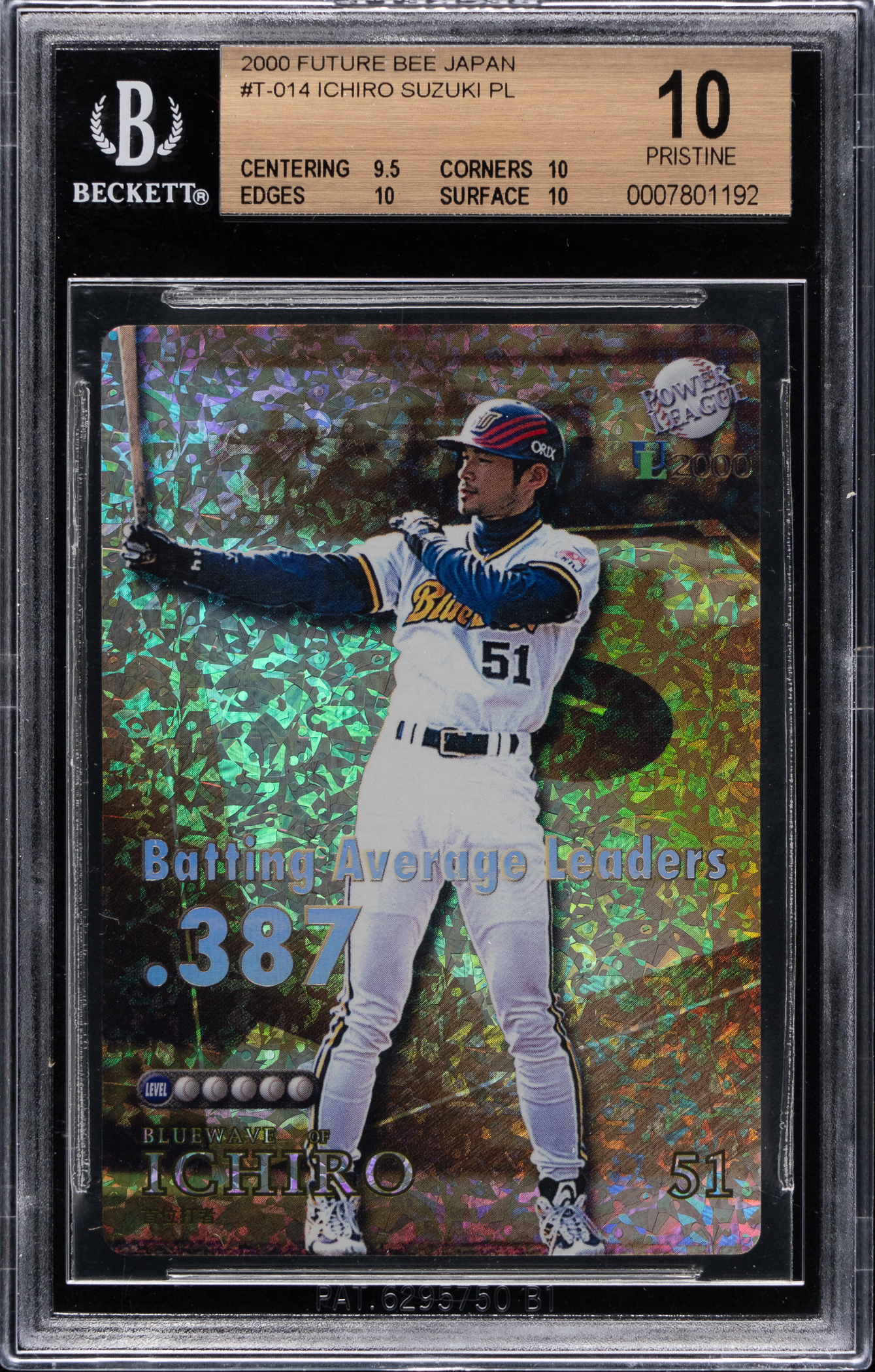 Graded PRISTINE 10 by BGS. Long before establishing himself as one of the best contact hitters in MLB history, Hall of Famer Ichiro Suzuki was an upstart for the Orix BlueWave in Japan's Pacific League. Featured is a perfect 2000 Future Bee Power League Stadium UL #T14 insert card picturing the Seattle Mariners legend. The sub-grades are as follows: Centering: 9.5; Corners: 10; Edges: 10 and Surface: 10.