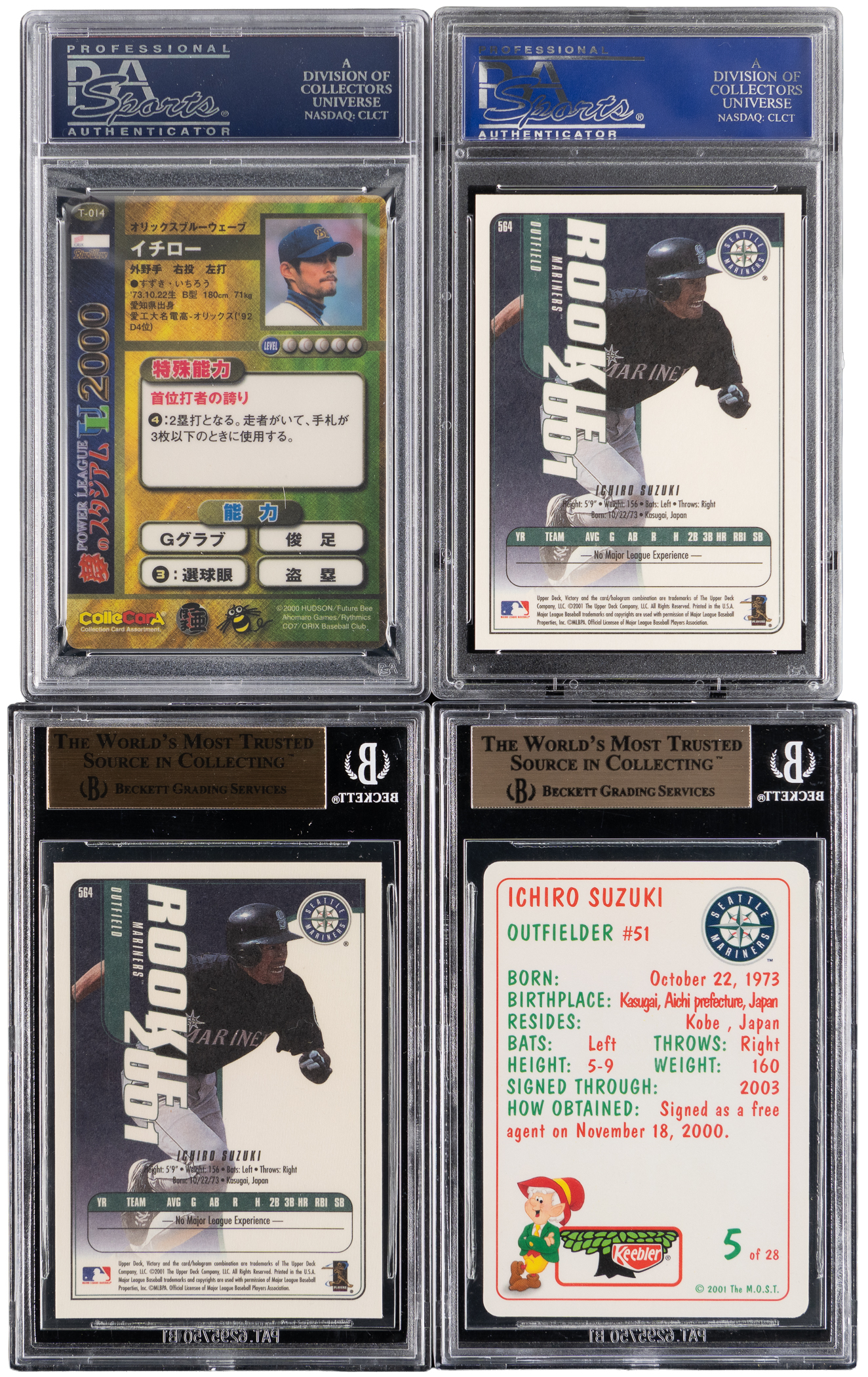 "Blue Chip" quartet of high-grade 2000-2001 Ichiro Suzuki rookie cards. Includes: PSA GEM MINT 10: (2 cards) with 2000 Future Bee Power League Stadium UL #T14, 2001 Upper Deck Victory #564 RC; BGS GEM MINT 9.5: (2 cards) with 2001 Keebler Seattle Mariners #5 and 2001 Upper Deck Victory #564 RC.
