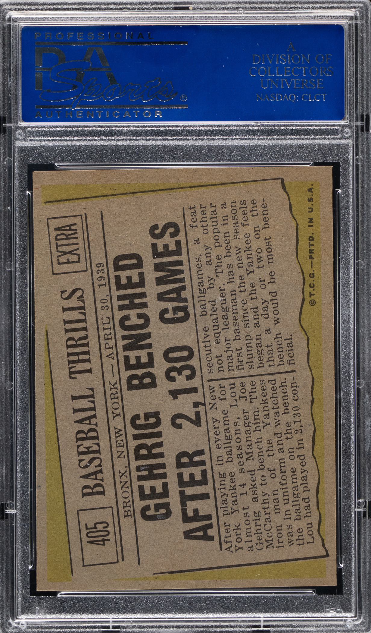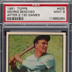 Graded MINT 9 by PSA. Boost your Registry standing with the offered 1961 Topps #405 Lou Gehrig Streak specialty card. This centered blazer of the New York Yankees Hall of Fame slugger ranks in the upper 3% of all similar copies judged by the authenticator. Only one copy graded higher.
