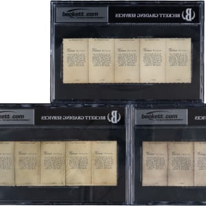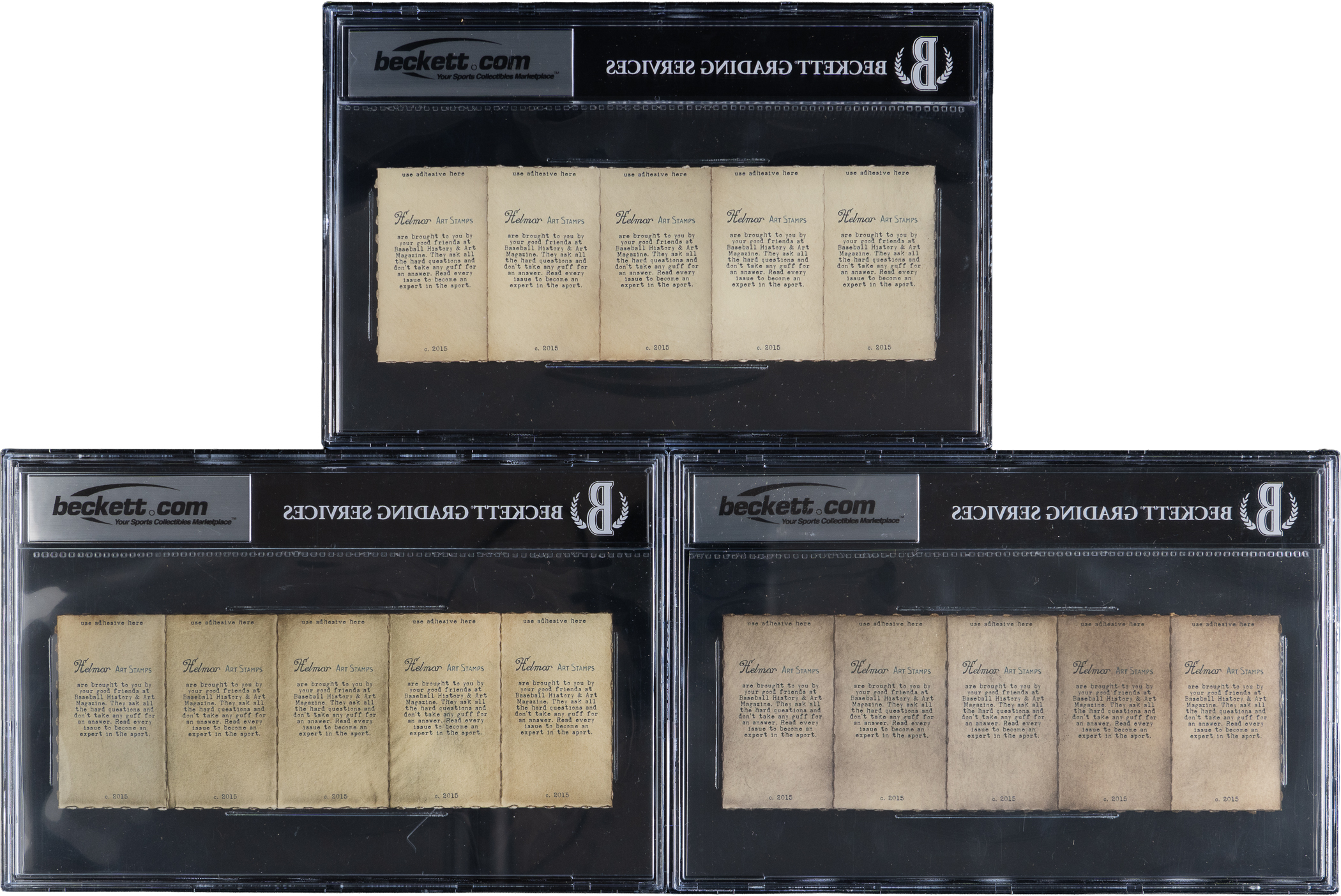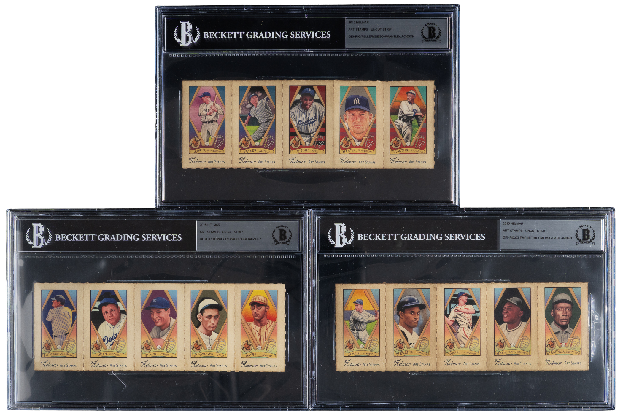 Some of the finest and possibly most attractive sports memorabilia issues of the early 21st Century are the Helmar Brewing Co. series of trading cards and advertising premiums. Each encapsulated by BGS with no numerical grades. Offered is a trio of 2015 Helmar Art Stamps uncut strips patterned after the 1914 T330-2 Piedmont Art Stamps designation. Includes: 1.) Gehrig/Clemente/Musial/Mays/Stearnes; 2.) Gehrig/Feller/J. Gibson/Mantle/J. Jackson and 3.) Ruth (New York)/Ruth (Boston)/Gehrig/Gehringer/Hafey.