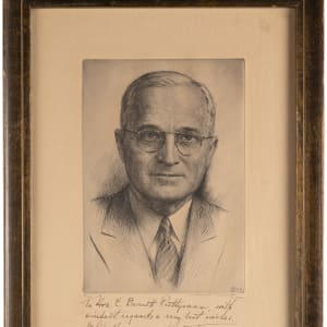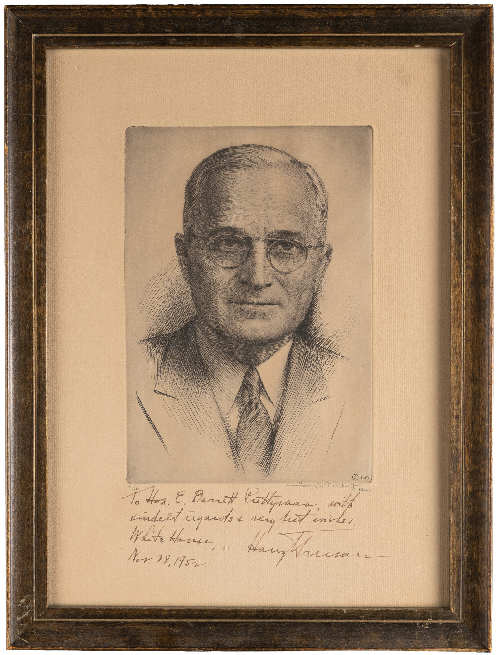Cast your vote for this Harry Truman signed art print in framed display. Truman was nearing the end of his time in office as our 33rd President when he signed this piece, as evidenced but the date-inscribed dedication applied to the matted area at bottom, which reads in full as "To Hon. E. Barrett Perryman, with kindest regards & very best wishes. White House, Nov. 28, 1952, Harry Truman". Truman (d.1972) left office on January 20, 1953. Barret was a U.S. circuit judge. Housed in a period frame showing moderate wear, this display measures 12" x 16" overall. Truman's signature and note remain distinct. Artist Harry S. Moskowitz of Philadelphia has signed on the matting directly below the portrait image area, and he has included the limited-edition numbering "84/125".