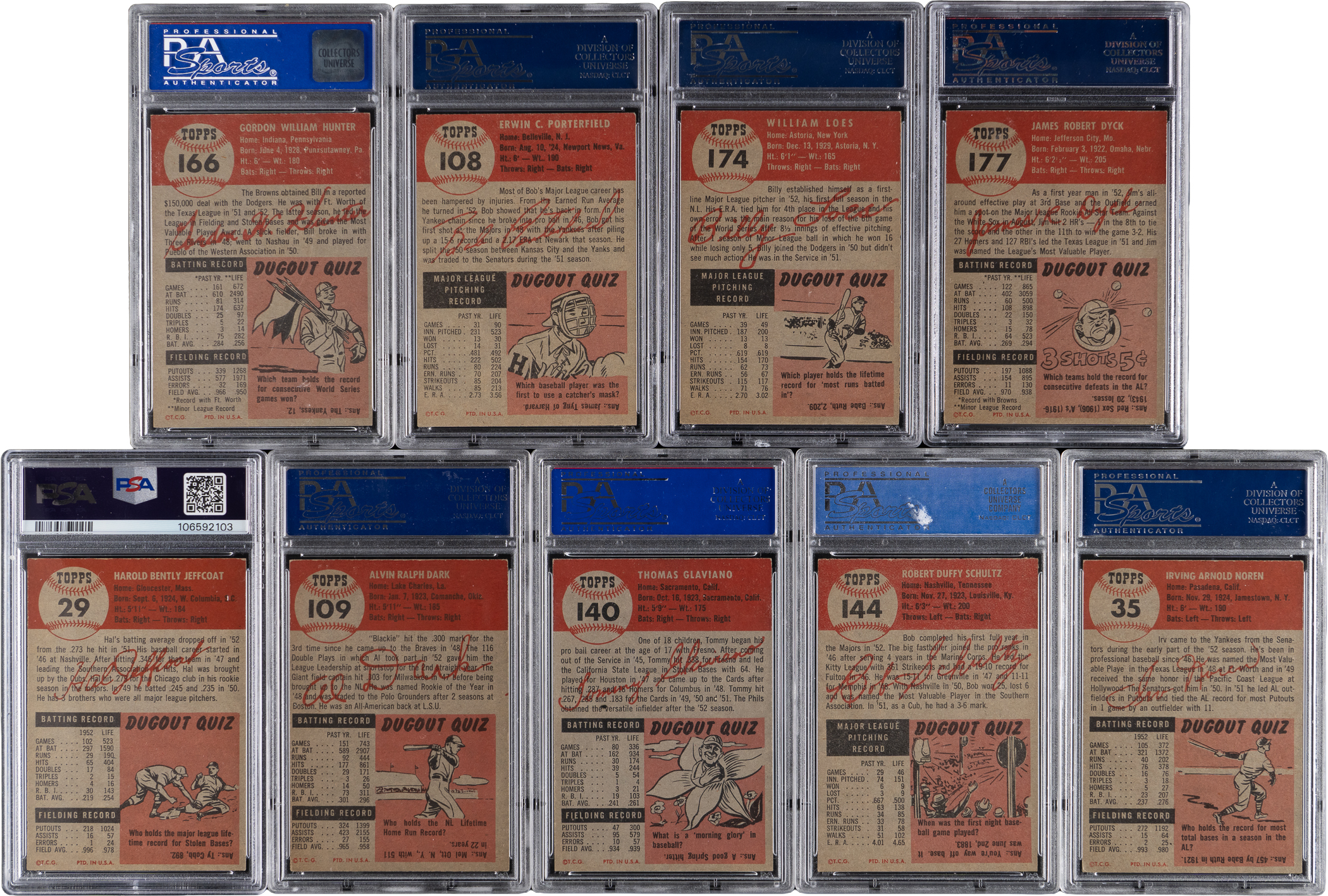Each graded either EX-MT+ 6.5 to NM 7 by PSA. Prime nine of clean 1953 Topps gum cards. Includes: PSA NM 7: (5 cards, includes one qualifier) with #29 Jeffcoat, #109 Dark (oc), #140 Glaviano, #144 Schultz, #166 Hunter; PSA EX-MT+ 6.5: (4 cards) with #35 Noren, #108 Porterfield, #174 Loes and #177 Dyck.