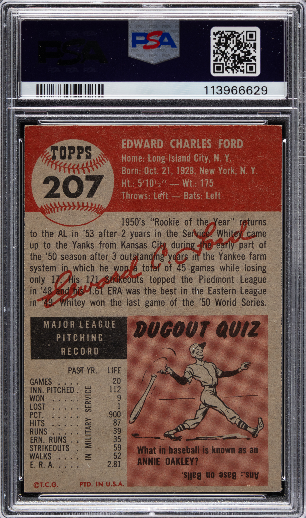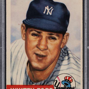 Graded EX-MT 6 by PSA. The first Topps card of New York Yankees Hall of Fame southpaw Ed (Whitey) Ford.