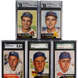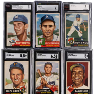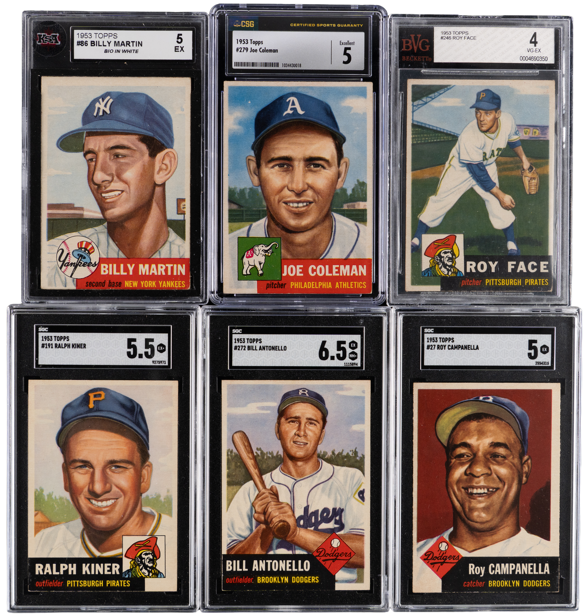 Sampling of (11) different 1953 Topps graded singles featuring a triple play of Hall of Famers and additional tougher high numbers. Includes: SGC NM+ 7.5: #209; GAI EX-MT+ 6.5: #201; SGC EX/NM+ 6.5: #272 Antonello; GAI EX-MT 6: #218; SGC EX/NM 6: #144; SGC EX+ 5.5: (2 cards) with #191 Kiner, 213; CSG EX 5: #279 Coleman; KSA EX 5: #86 B. Martin; SGC EX 5: #27 Campanella and BVG VG-EX 4: #246 Face RC.