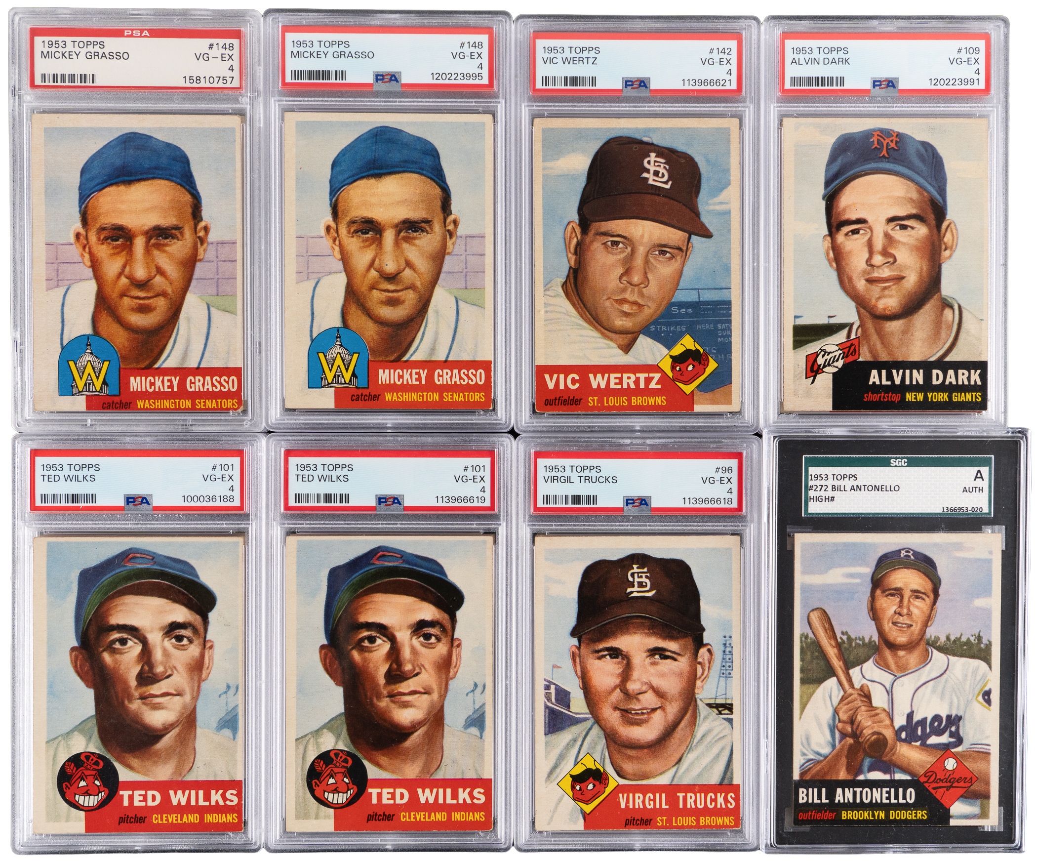 Selection of two dozen 1953 Topps graded cards featuring three tougher high numbers and additional semi-stars. Includes: PSA EX-MT 6: (3 cards) with #91, 110, 198; PSA EX 5: (8 cards) with #92, (2) 106, 109, 144, 146, (2) 148; PSA VG-EX+ 4.5: #101; PSA VG-EX 4: (10 cards) with #96, (2) 101, (2) 109, 142, (2) 148, #238 Hogue, #279 Coleman; PSA GOOD 2: #146 and SGC Authentic: #272 Antonello.