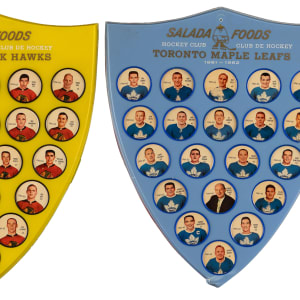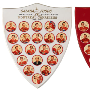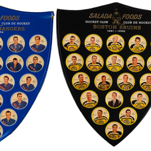 Original six greats are showcased in this exceptionally attractive 1961-1962 Salada/Shirriff Hockey complete set of (120) coins secured in their original team display shields. Although the majority are affixed in slots in their respective shields with mounting tape, the fronts generally present in high-brade condition. Additionally, the condition sensitive shields present remarkably well with insignificant perimeter wear or cracking to the plastic perimeters. Better names include: #22 Mikita, #25 Bo. Hull, #66 Howe, #77 Sawchuk, #102 Beliveau, #104 Geoffrion and #113 Plante.