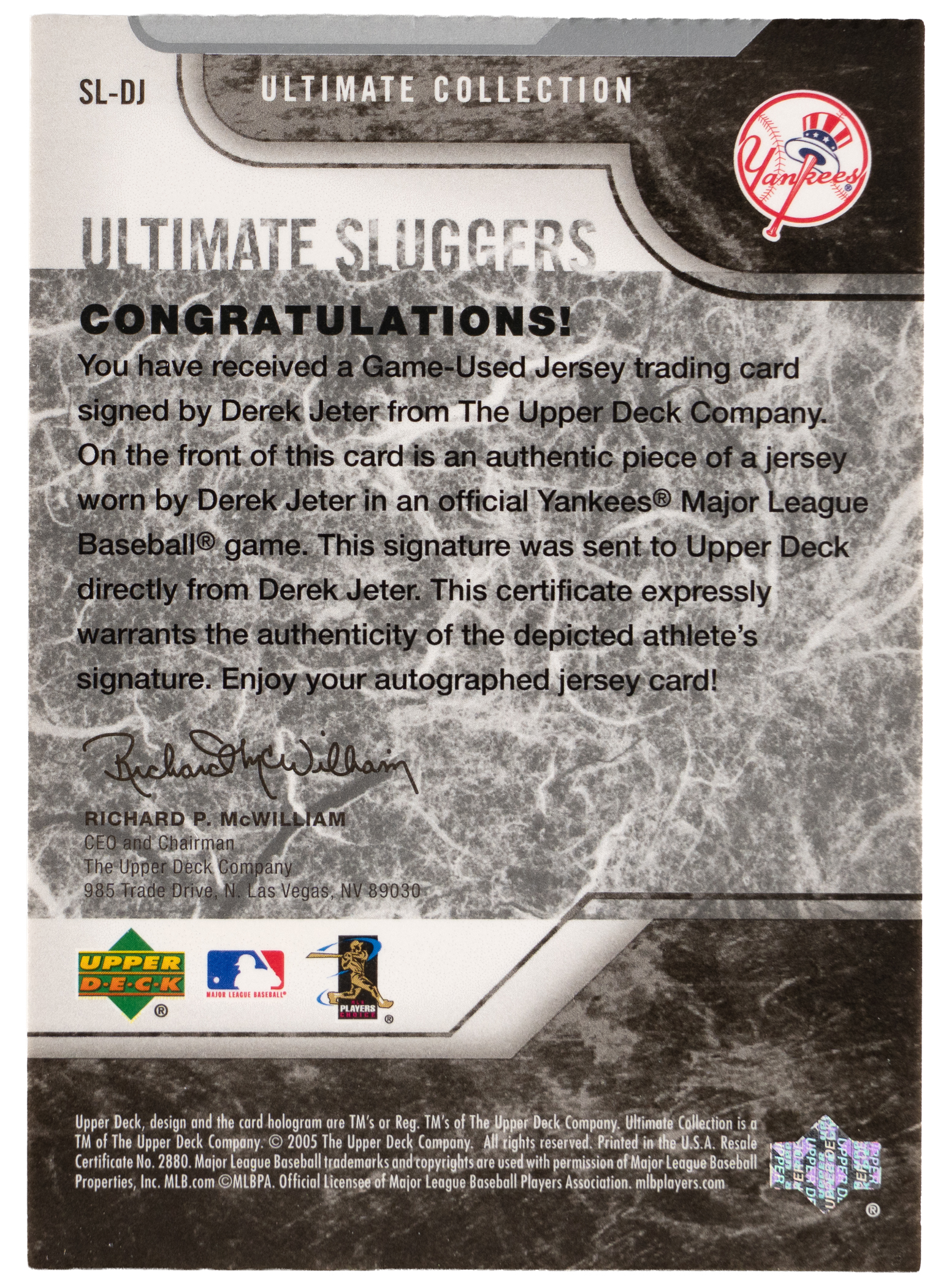Lot # 669: 2005 Upper Deck Ultimate Collection Ultimate Sluggers Derek Jeter Certified Autograph/Game-Used Jersey #5/20