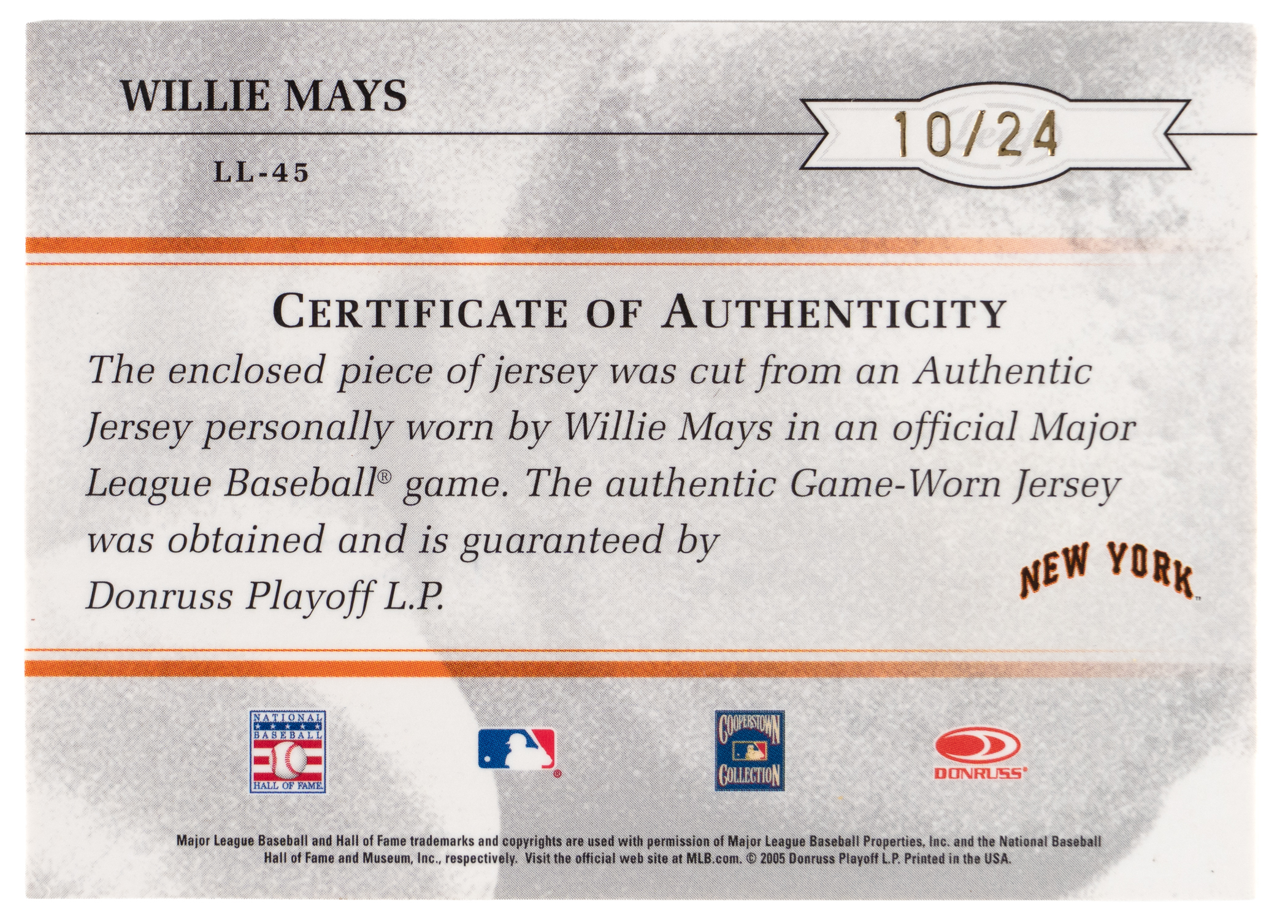Serially numbered #10/24. "Say Yes!" to the offered 2005 Leaf Limited Legends #45 Willie Mays certified autograph/game-used jersey combo. San Francisco Giants Hall of Famer.