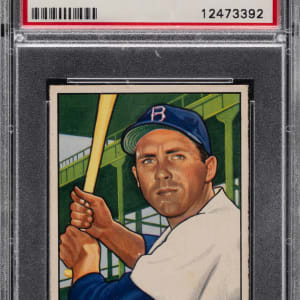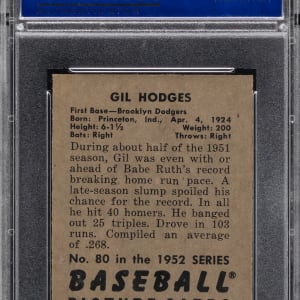 Graded NM 7 by PSA. Sterling 1952 Bowman #80 gum card of Brooklyn Dodgers Hall of Fame first baseman Gil Hodges.
